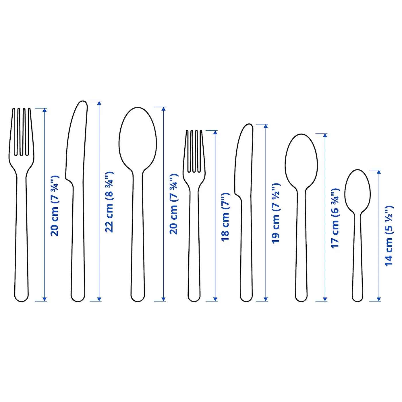 Включает: вилку, нож, ложку, чайную ложку, десертную/салатную вилку, десертный/салатный нож и десертную/салатную ложку, по 8 штук каждого.