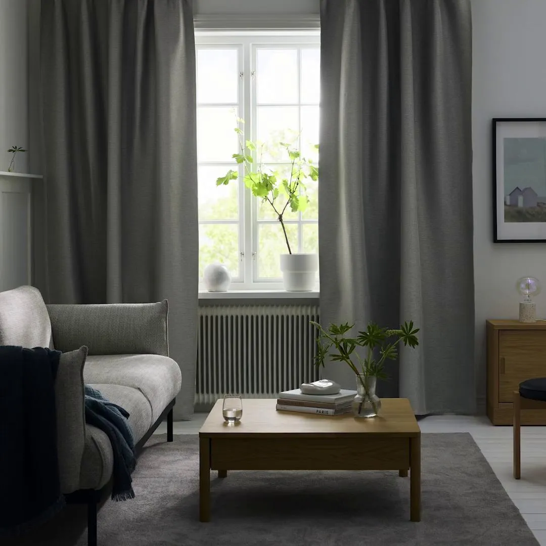 Серые шторы VILBORG с линейной текстурой. Прочная и легкая в уходе ткань изолирует и затемняет комнату, не создавая ощущения громоздкости. Универсальный крепеж позволяет выбрать различные способы подвешивания.