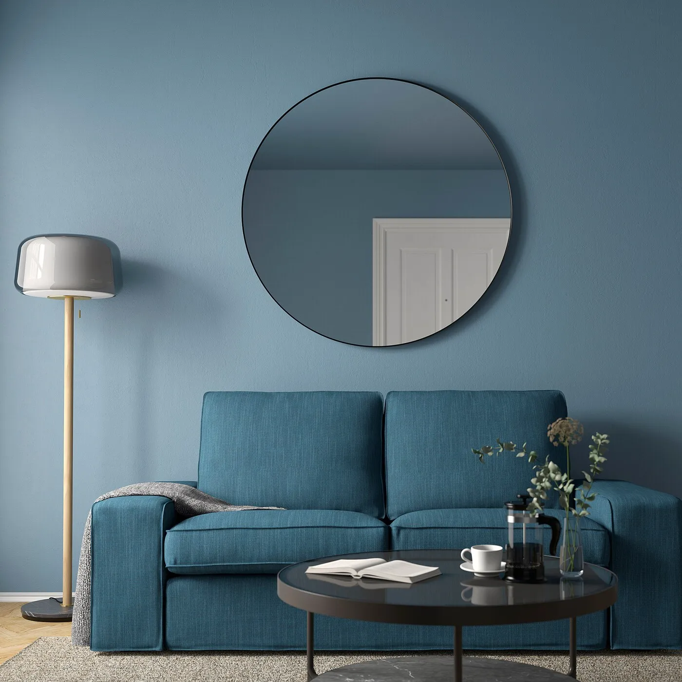 Зеркала помогают добавить комнате глубину и динамику. Круглое зеркало LINDBYN с мягкими очертаниями и черной рамкой выглядит элегантно.