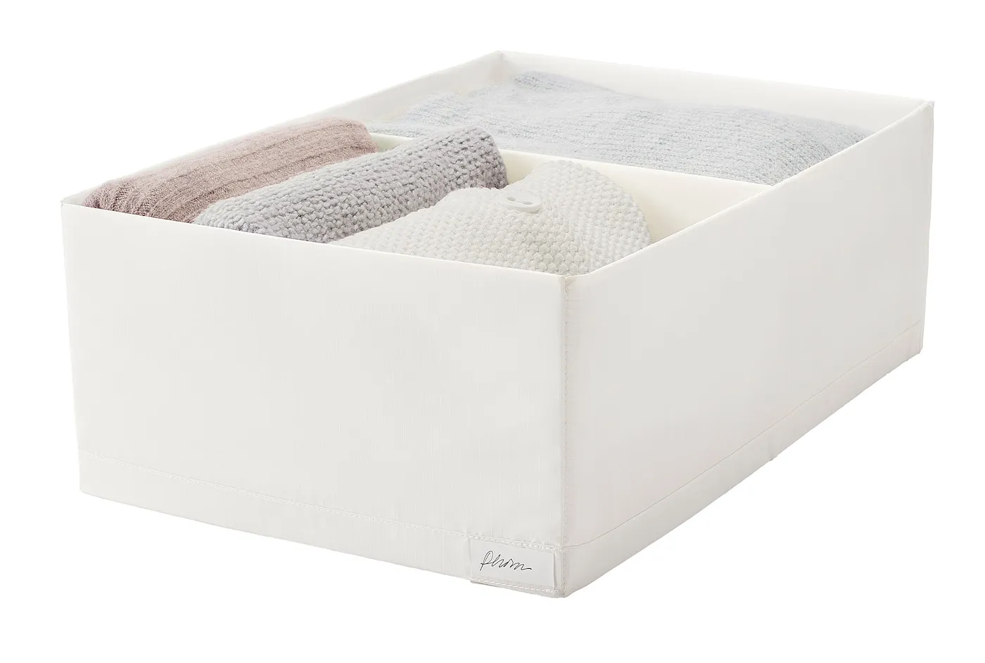 Используйте одну коробку для носков, другую — для спортинвентаря или сложенных свитеров. Эти коробки помогают разделить вещи и эффективно использовать пространство. Комбинируйте с другими продуктами серии STUK для идеального порядка в хранилищах.
