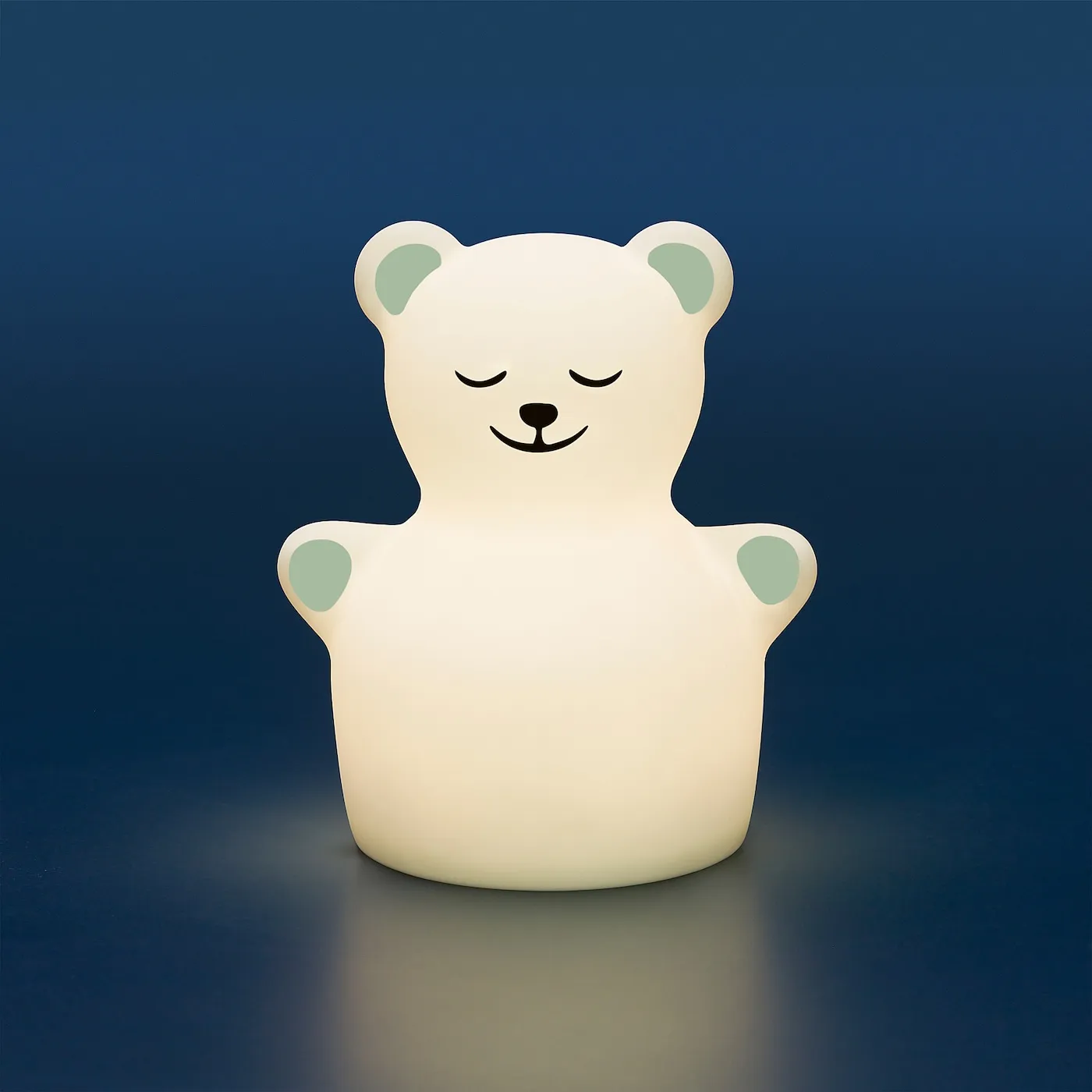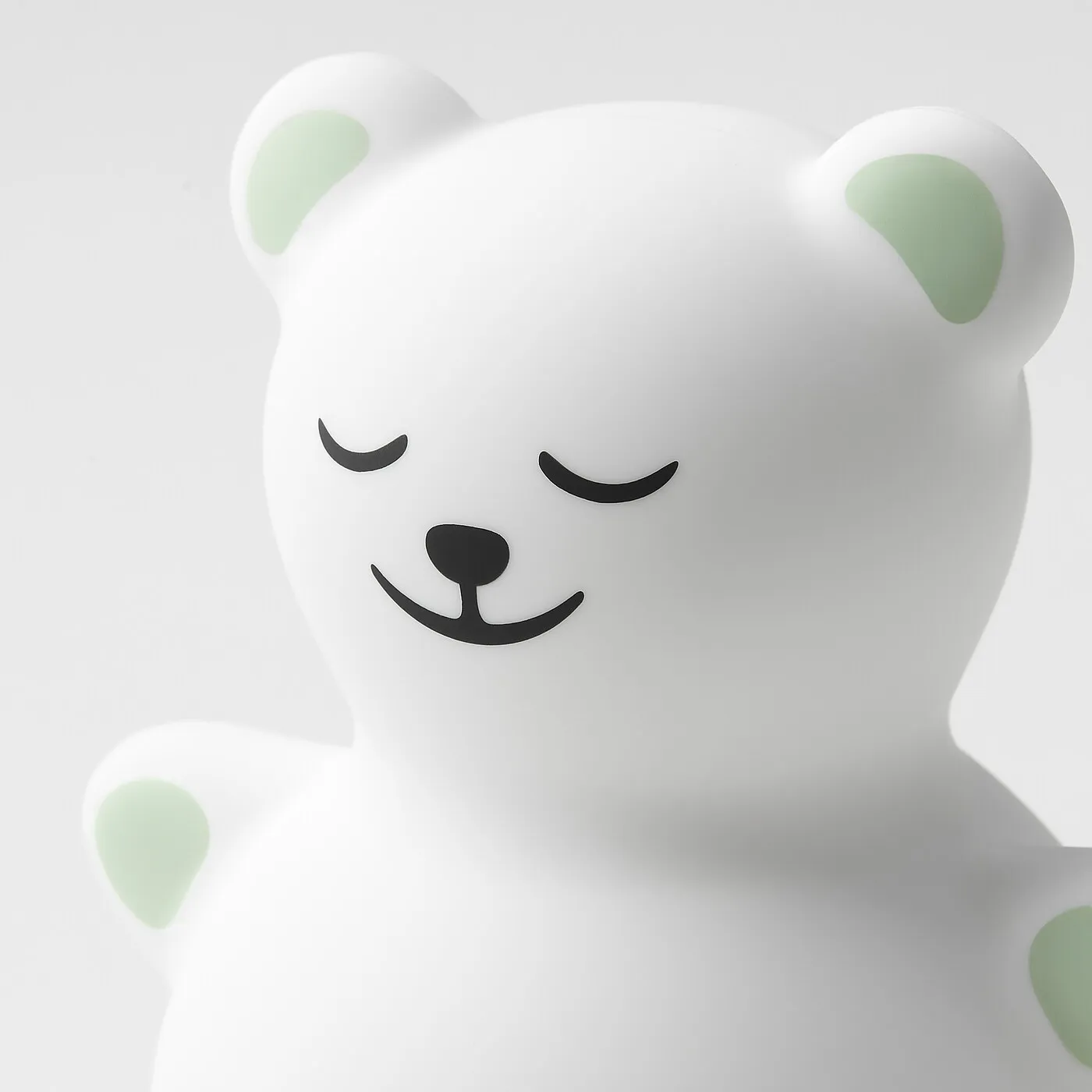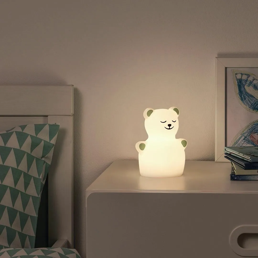 С одной стороны лампы у медвежонка открыты глаза и ярко-желтые ушки, а с другой стороны глаза закрыты и ушки зеленые.