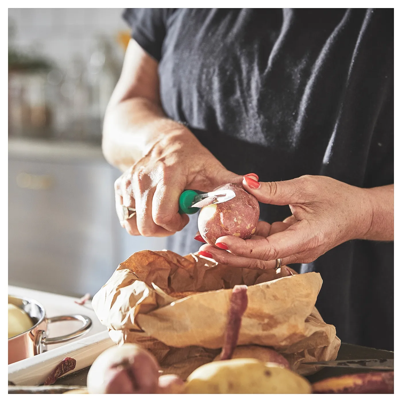 Компактная и надежная овощечистка UPPFYLLD легко используется и моется как вручную, так и в посудомоечной машине. Ее можно повесить за отверстие в ручке или хранить в ящике — благодаря зеленому цвету ее легко найти!