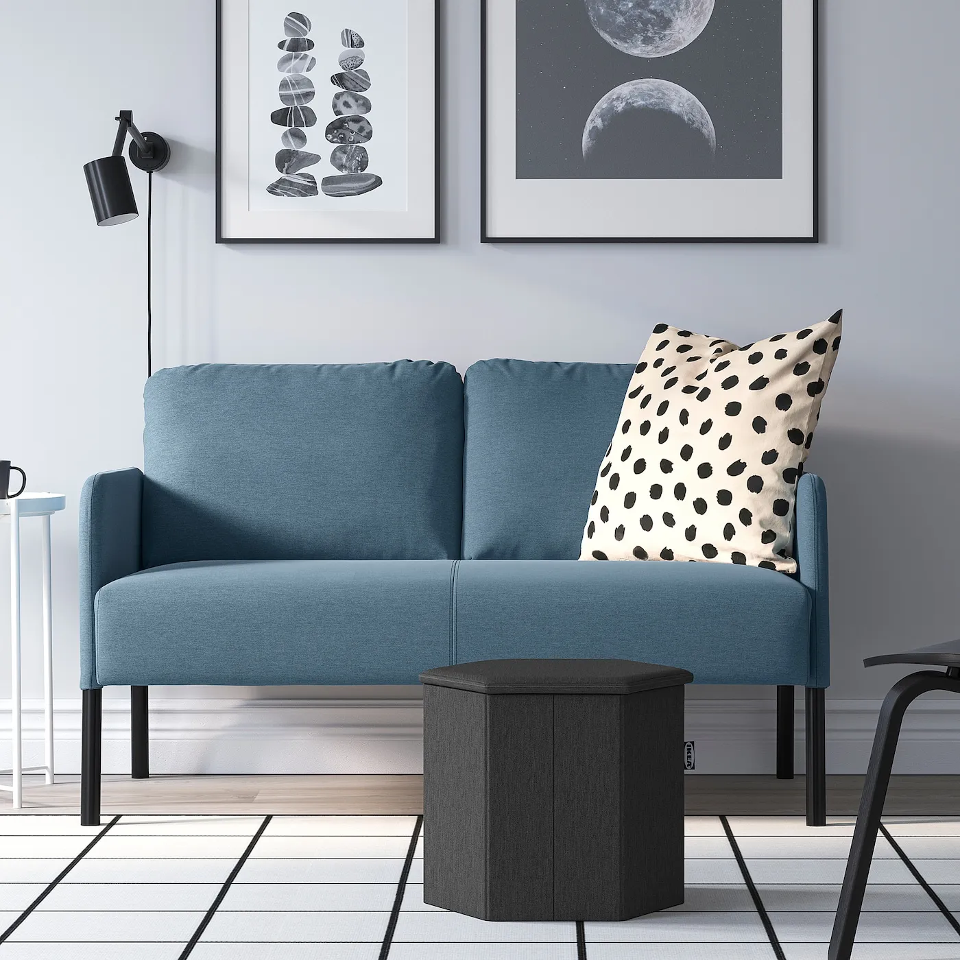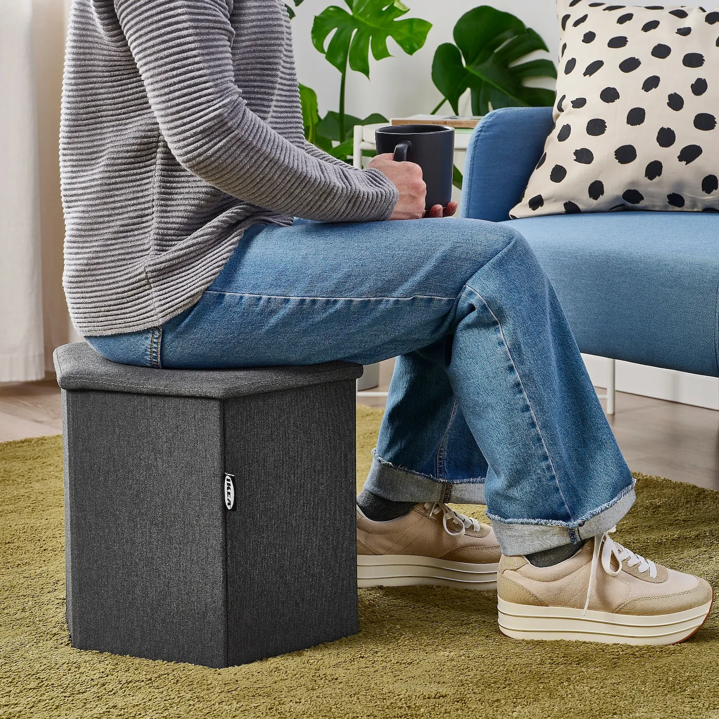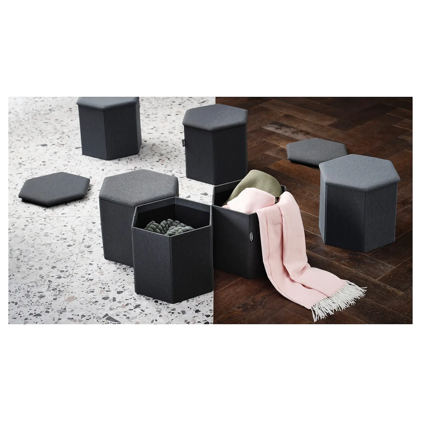 KJUGE — это три в одном: удобный пуф для отдыха ваших ног, дополнительное место для гостей и умное хранение, чтобы поддерживать порядок. Почему бы не объединить несколько пуфов и создать уникальную композицию?