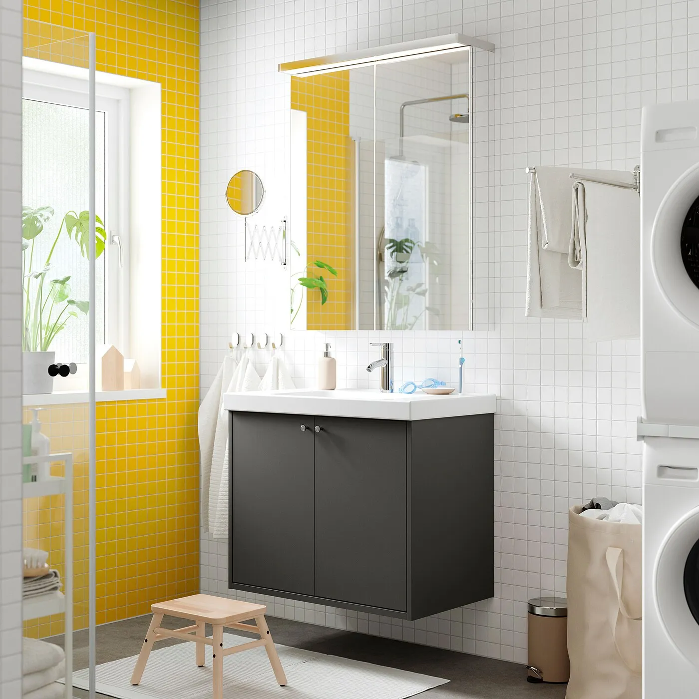 Четкий дизайн и матовая темно-серая отделка придают вашей ванной уверенное выражение и теплую атмосферу, которую легко персонализировать, выбрав соответствующие ручки или кнопки.