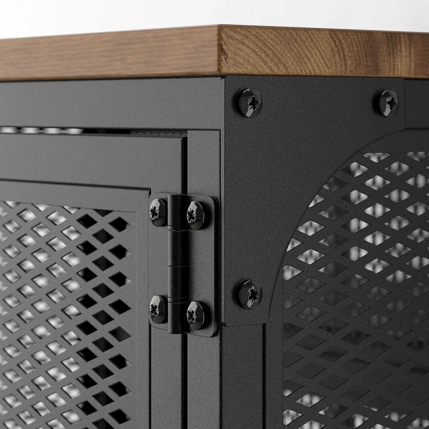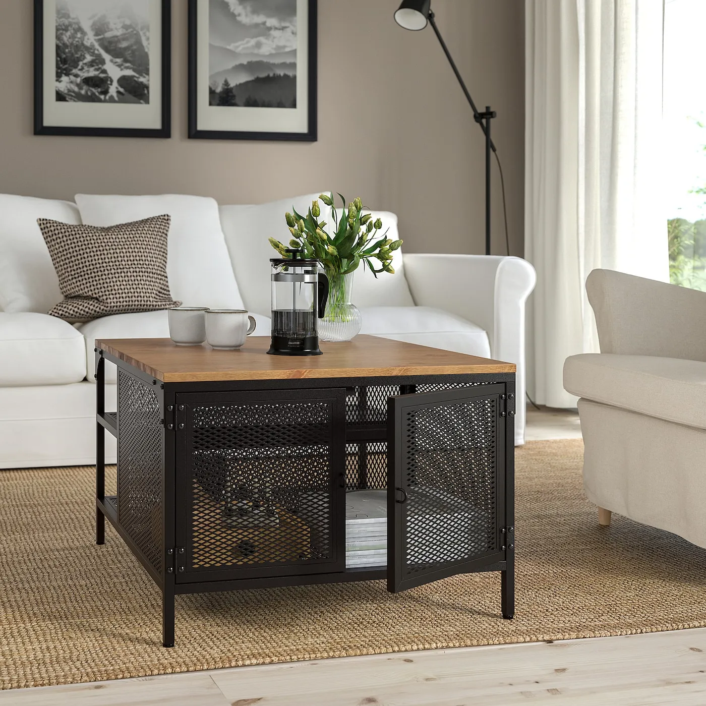 FJÄLLBO стол с хранением сочетает индустриальный стиль черного металла с теплым и натуральным видом массива дерева.