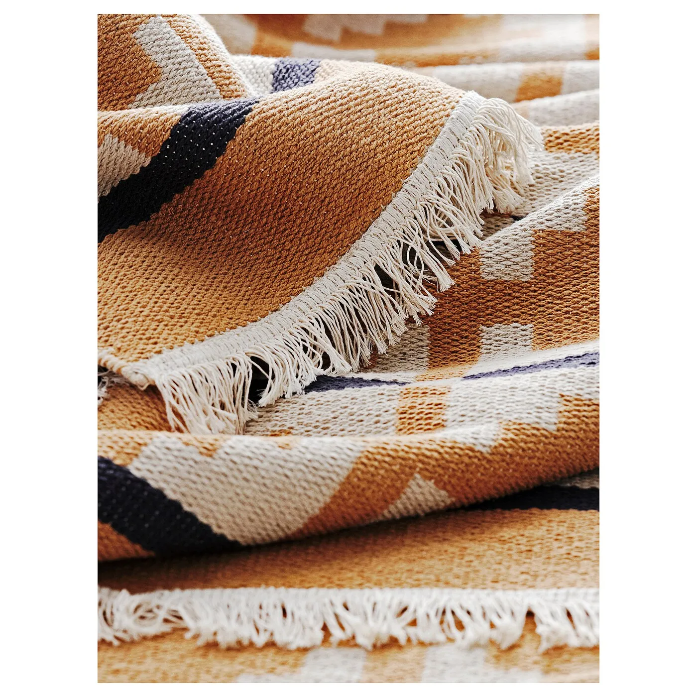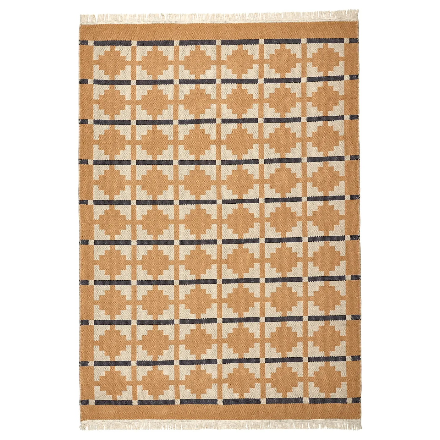 Геометрический узор в теплых тонах добавляет уюта и индивидуальности вашему интерьеру. Ковер плетеный, благодаря чему он прекрасно подходит и для обеденной зоны, и для гостиной.