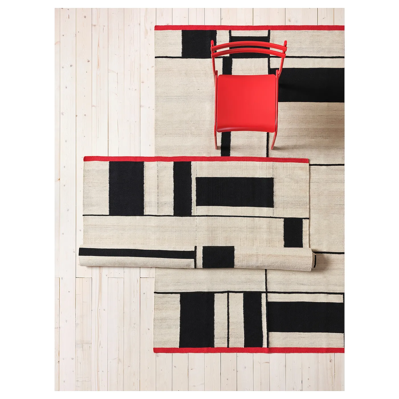 Ковер с плоским плетением имеет графичный узор в виде прямоугольников в бежево-черных оттенках, раскинувшийся на мягкой шерстяной поверхности. Классический вид с красными краями, придающими современность. Универсален и подходит практически для любого помещения.