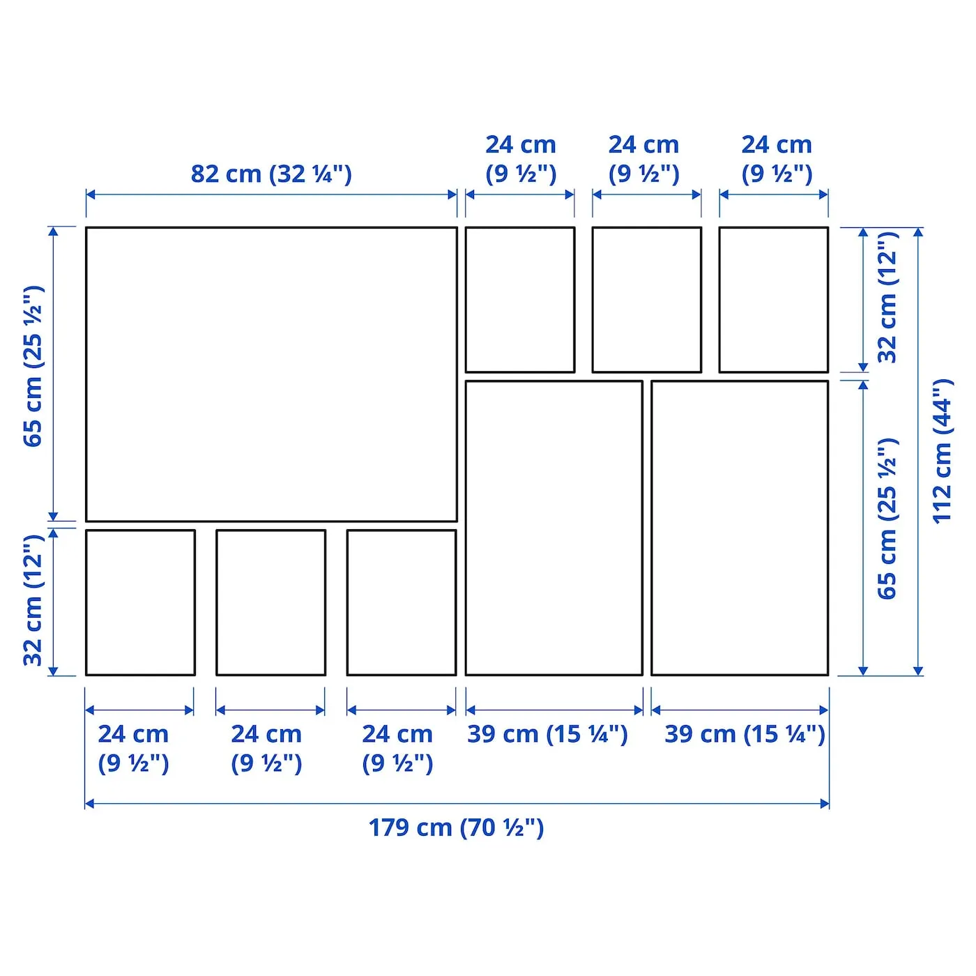 В набор входят: 1 шаблон для подвешивания, 6 картин 24x32 см, 2 картины 39x65 см и 1 картина 82x65 см.