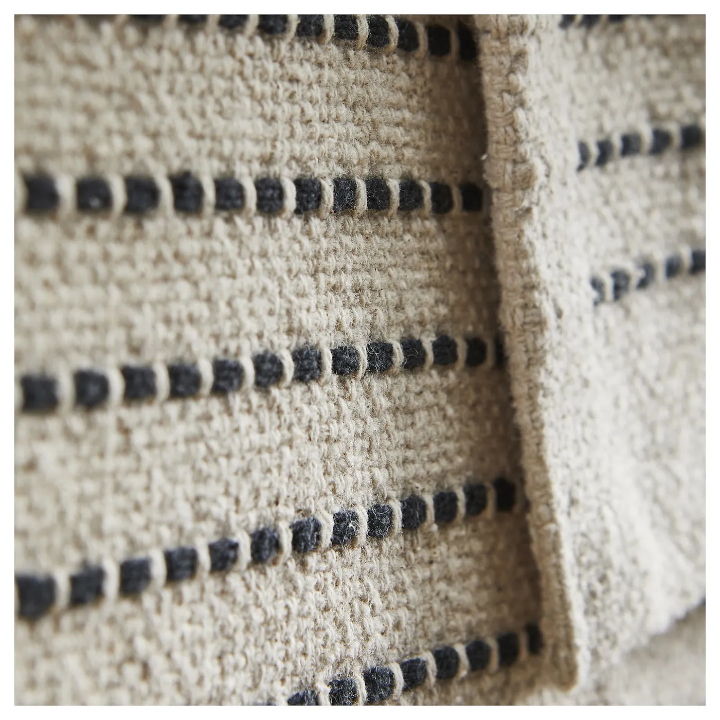 Этот ковер натурального оттенка с черными полосами имеет вневременной вид, который легко сочетается с различной меблировкой и текстилем. Прекрасно смотрится и в спальне, и в прихожей.