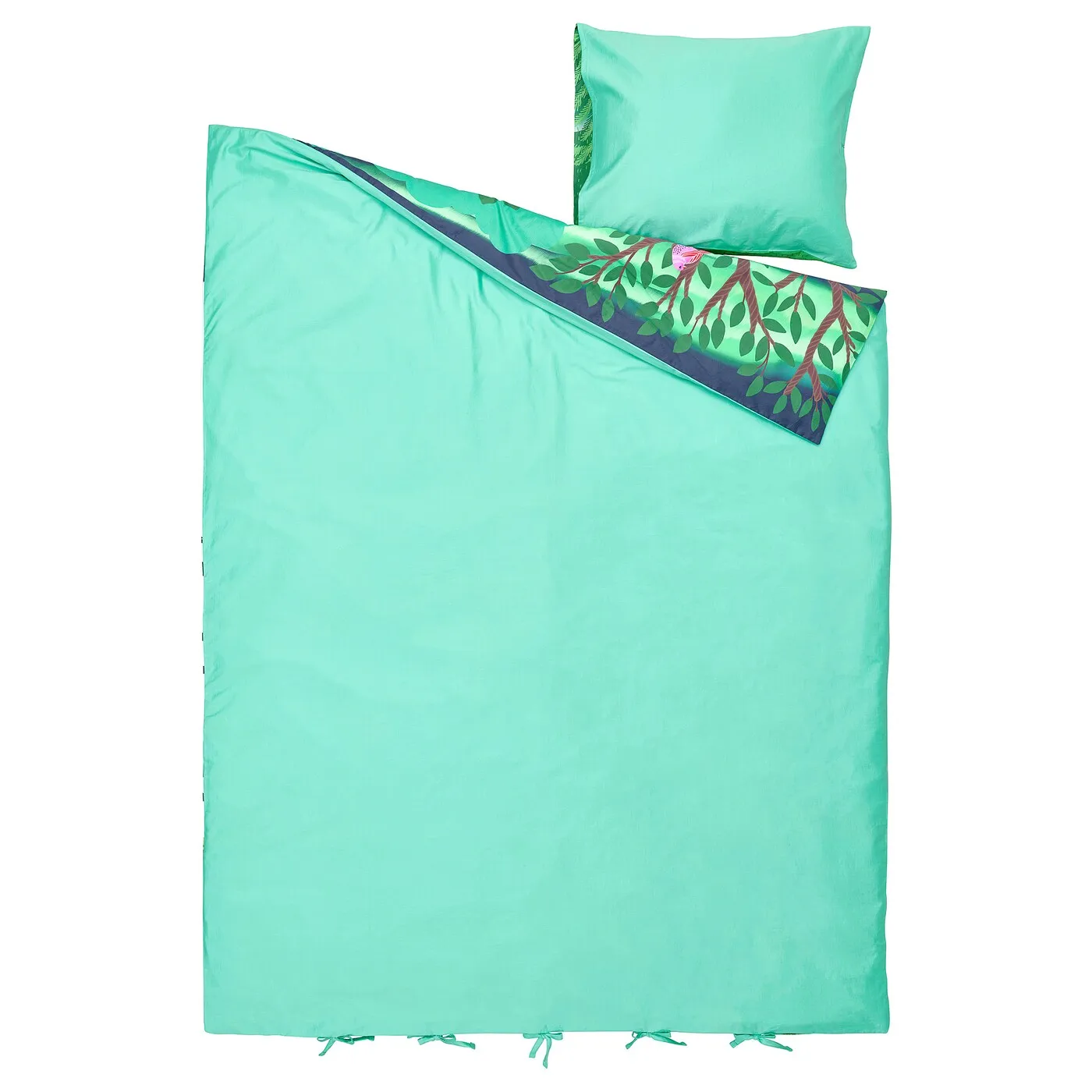На этом пододеяльнике маленькая мышка отдыхает в своем гамаке. Возможно, чтобы набраться сил перед чаепитием с ежиком на сумочке из коллекции SKOGSDUVA?