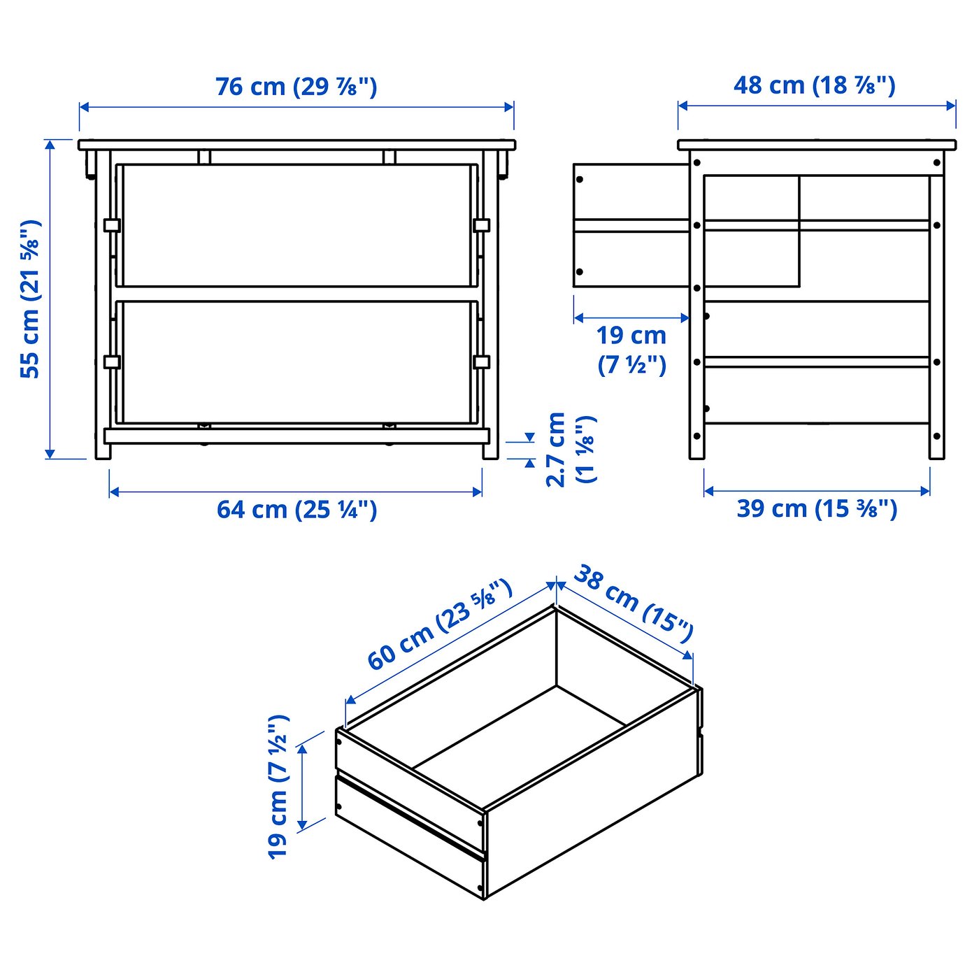 Изготовлено из массива дерева, которое можно шлифовать, покрывать маслом, лаком, морилкой или краской. Это делает комод долговечным, простым в уходе и дает возможность обновить его в любое время!