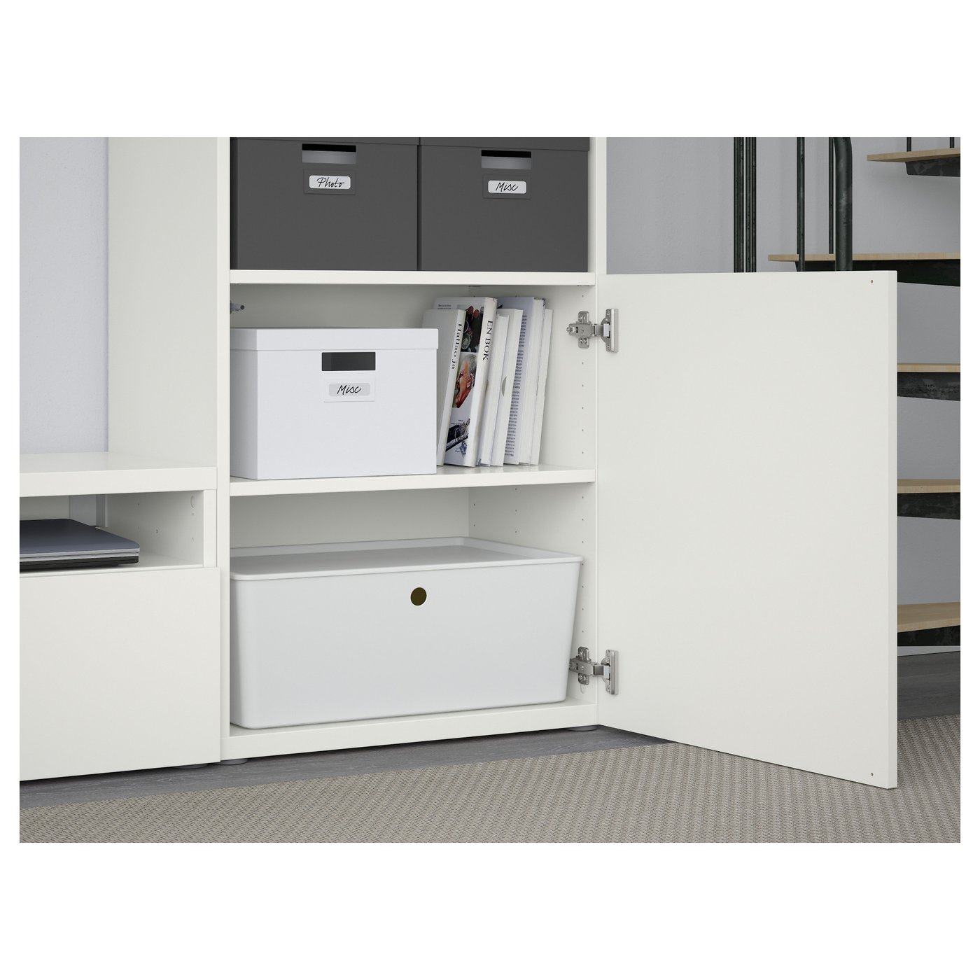 Иногда приятно, когда работа уже сделана за вас. Эта готовая комбинация включает ТВ-тумбу, настенные полки, два шкафа с стеклянными дверцами и умные дополнительные функции. Вам остается только решить, как её использовать!