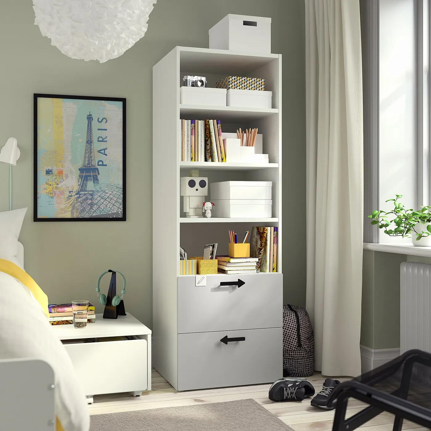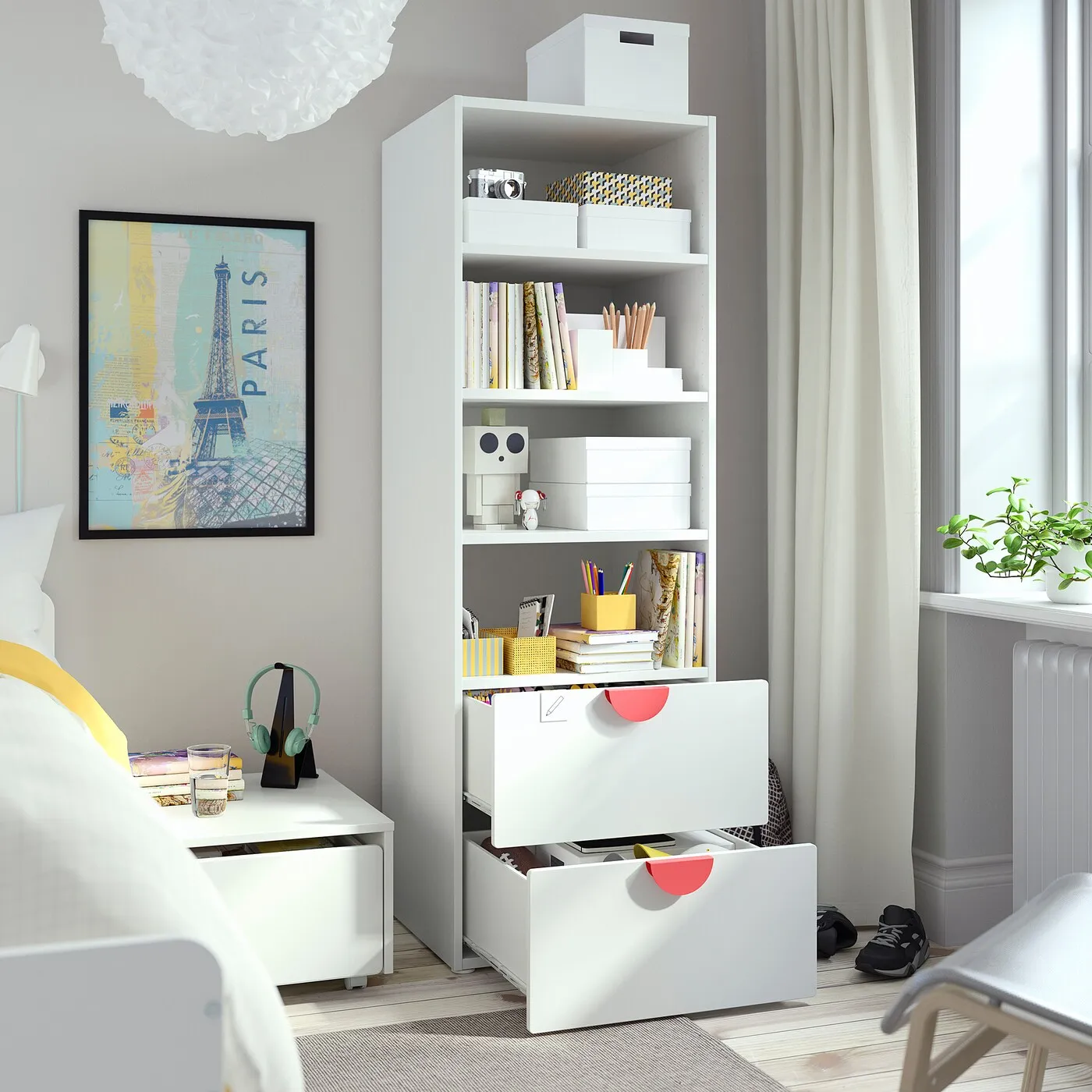 Этот книжный шкаф предлагает много места для хранения на небольшом пространстве — от детских лет до подросткового возраста. На открытых полках вы можете размещать вещи для легкого доступа, а в ящиках найдется место для предметов всех размеров.