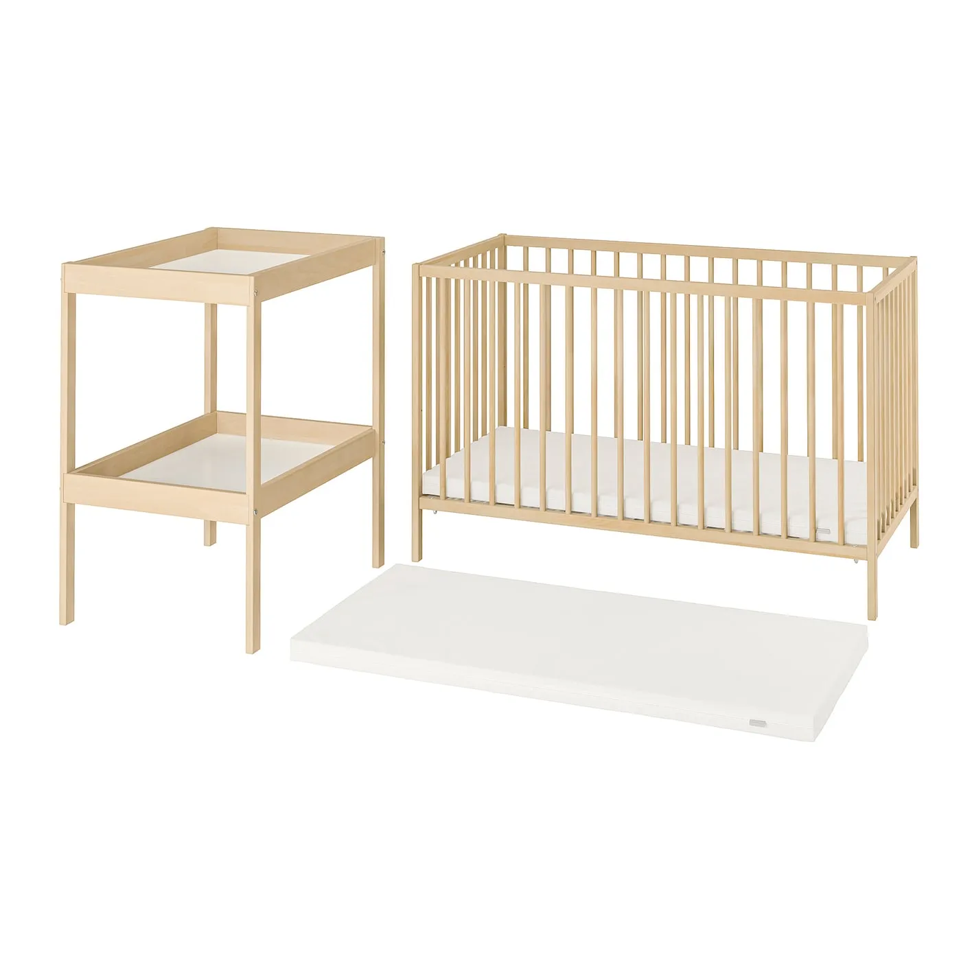 Кровать, в которой ваш малыш будет спать в безопасности, и пеленальный столик на удобной высоте с возможностью хранения предметов под рукой, обе мебели выполнены из массива бука. Прекрасный старт для создания уютного уголка для нового члена семьи.