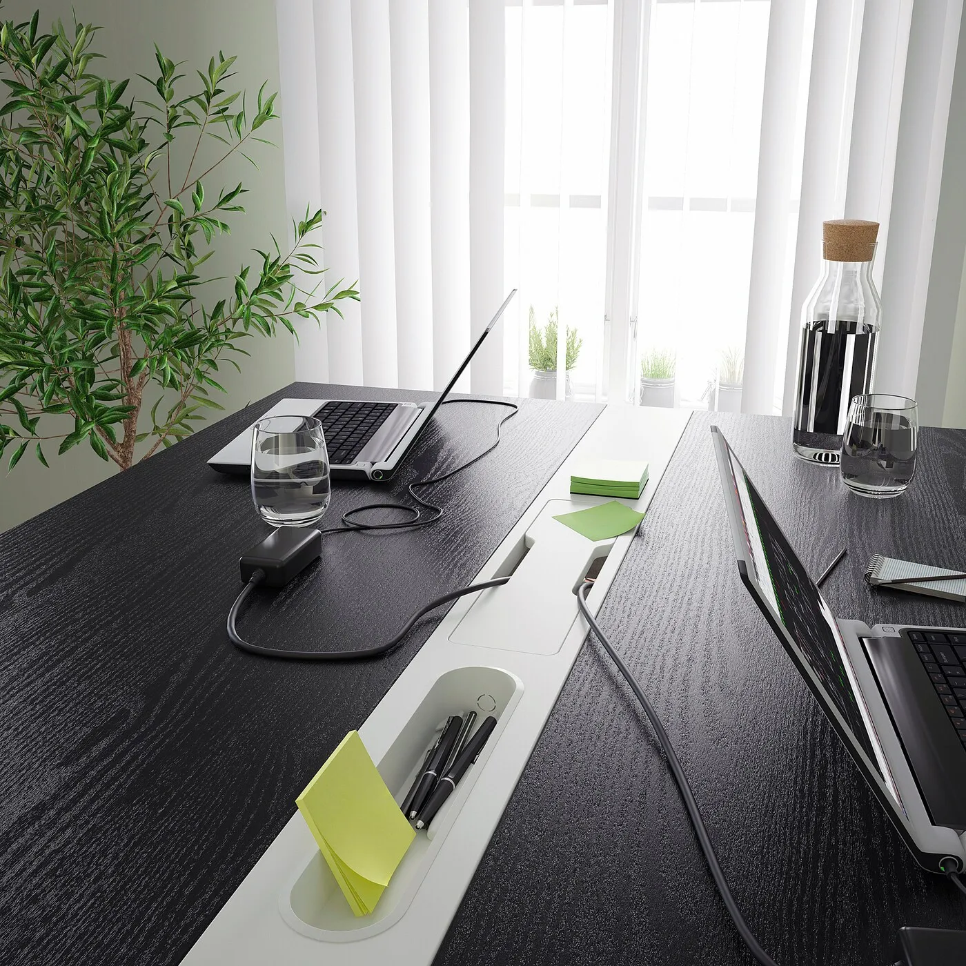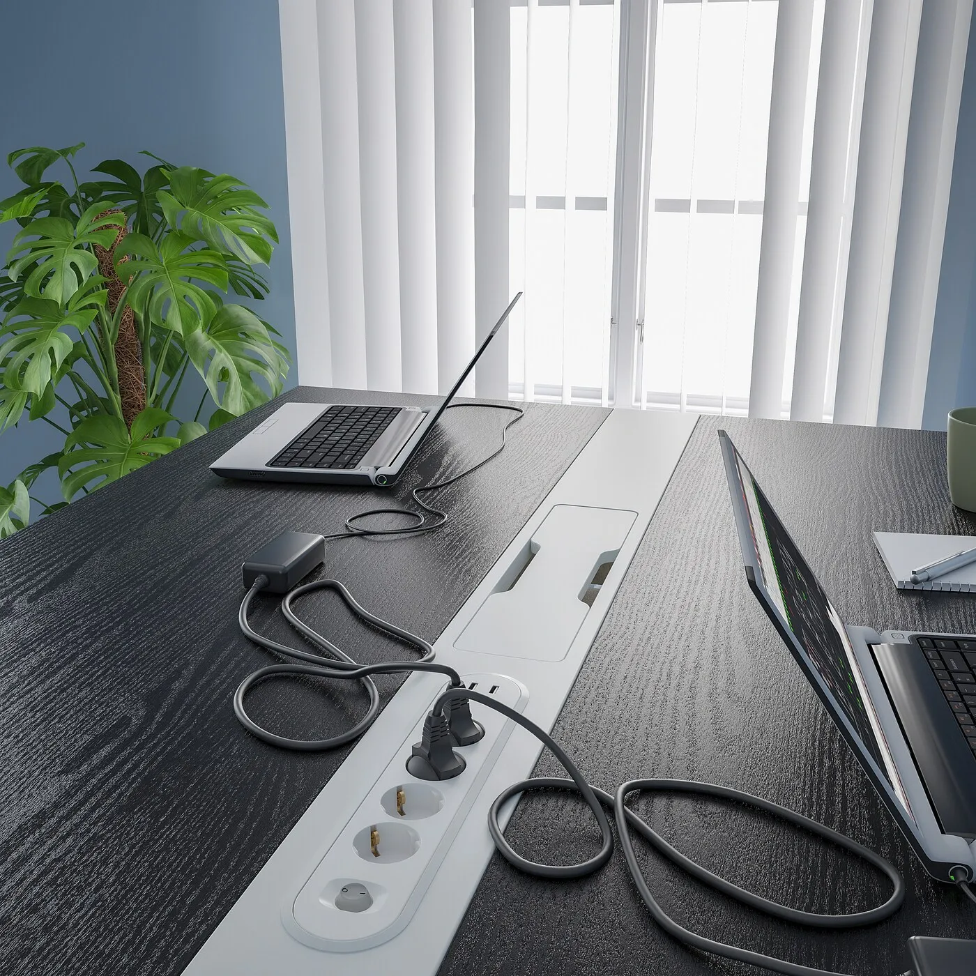 В комплекте модуль для управления кабелями, чтобы вы могли оставаться заряженными во время работы. Совместим со всеми розетками в мире, доступен сверху.