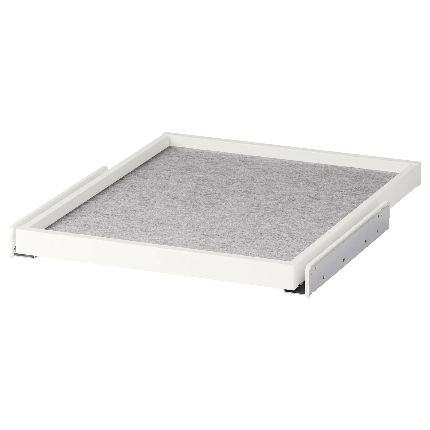 Коврик легко обрезается до нужного размера и формы. Он идеально подходит для самых больших ящиков KOMPLEMENT глубиной 58 см, а на обратной стороне есть направляющие линии, указывающие места для резки, чтобы подогнать его к меньшим размерам.