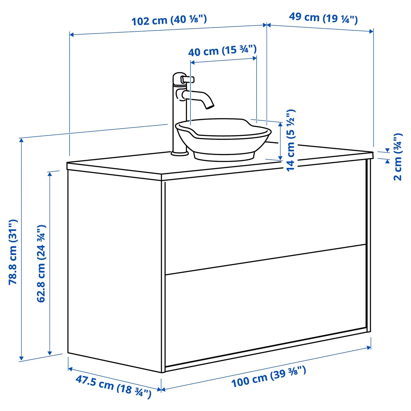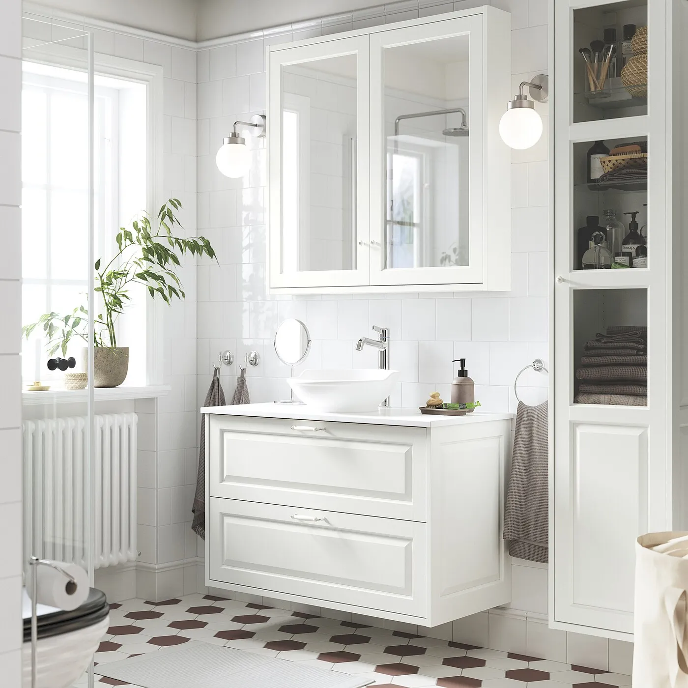 Мебель для ванной комнаты TÄNNFORSEN излучает классическую элегантность благодаря скошенным краям. Эта комбинация с круглым умывальником и возвышенной задней частью создает стильный акцент с тщательно продуманным внешним видом.
