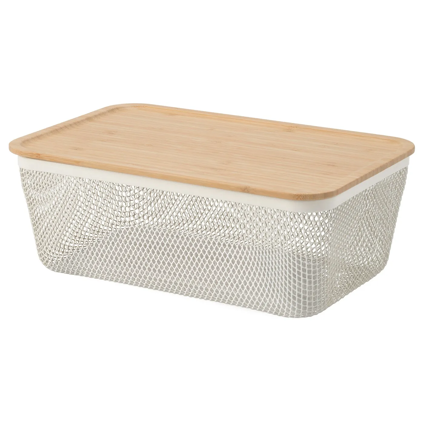 Комнатная температура и циркуляция воздуха улучшают вкус и продлевают срок хранения многих продуктов. Корзина для хранения IKEA 365+ с крышкой не только стильная, но и практичная, так как содержимое видно сквозь сетку.