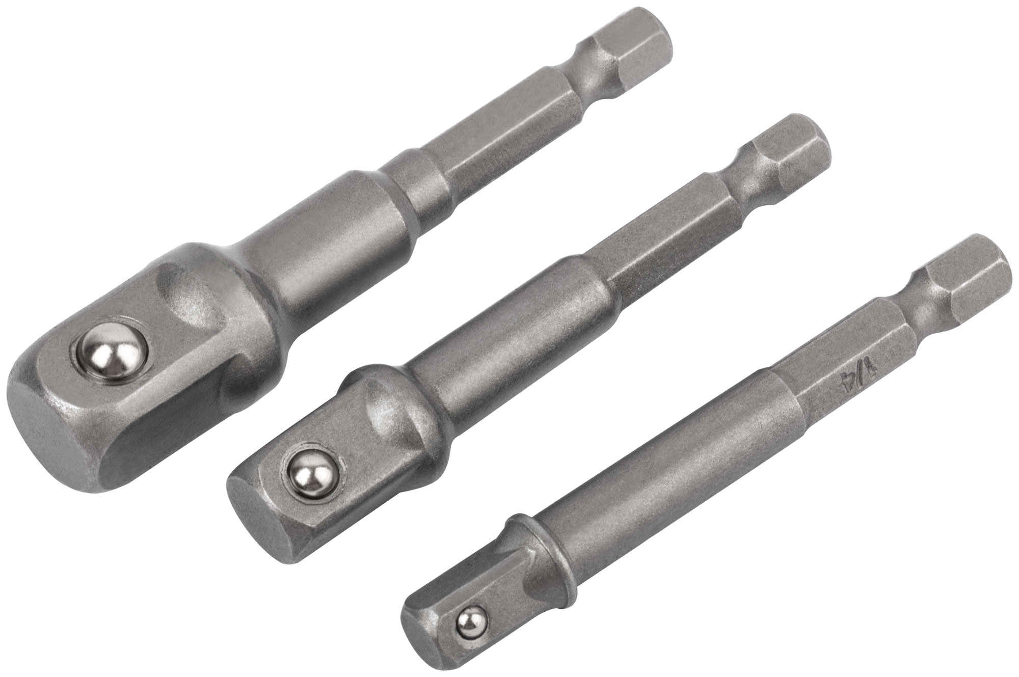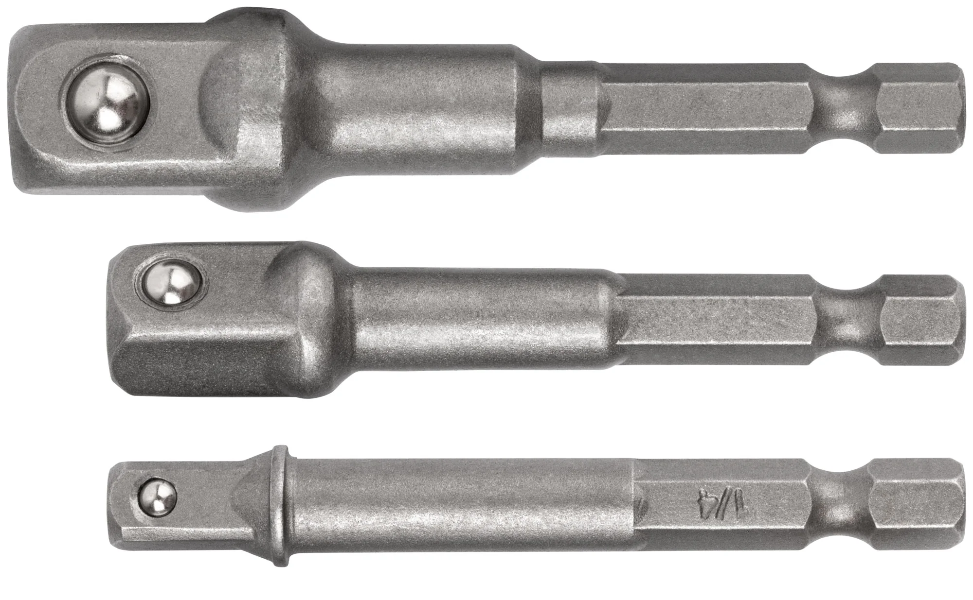 Комплект состоит из трех адаптеров различных размеров (1/4'', 3/8'', 1/2''), выполненных из легированной CrV стали, обеспечивающей прочность и долговечность каждого элемента.
