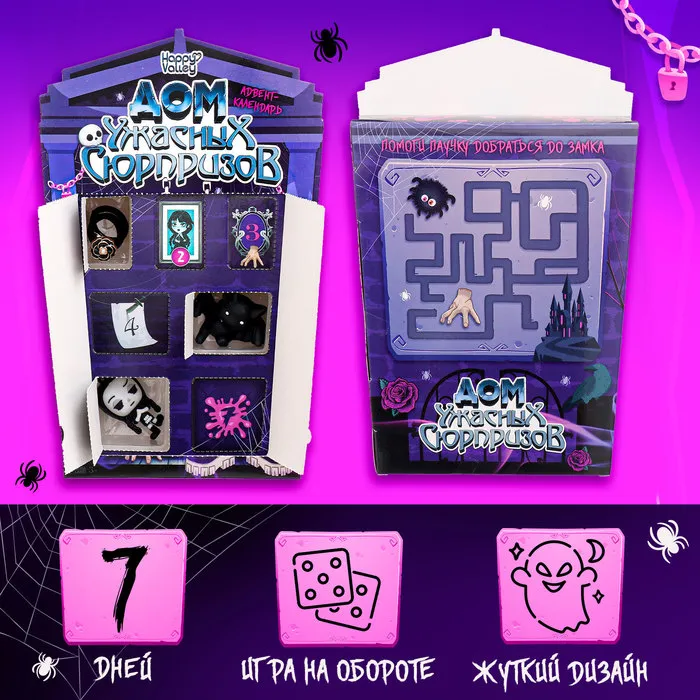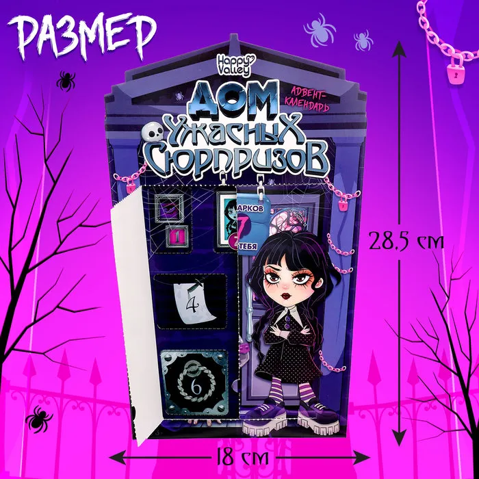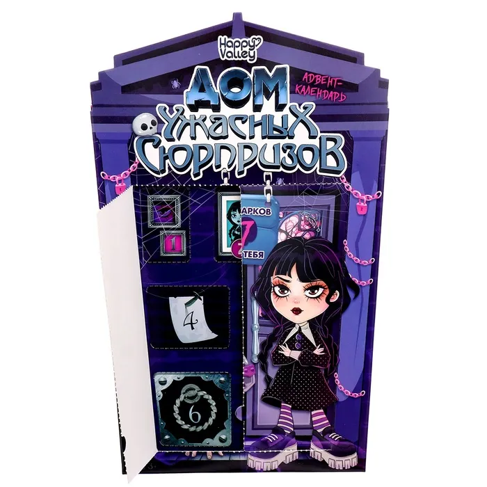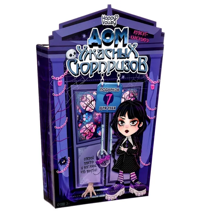 Адвент-календарь «Дом ужасных сюрпризов» станет отличным подарком на хэллоуин и на любой другой праздник. Он понравится каждой любительнице сериала про необычную девочку. В календаре вы найдёте 7 окошек с сюрпризами, открывайте по одному окошку каждый день!
