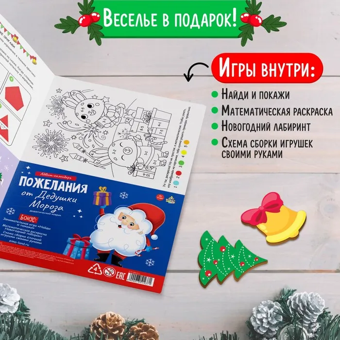 Яркие игрушки украсят праздничную ёлку, создавая атмосферу волшебства и уюта в доме. Очаровательный подарок адвент-календарь «Пожелания от Дедушки Мороза» подарит радостные эмоции и разовьёт воображение.
