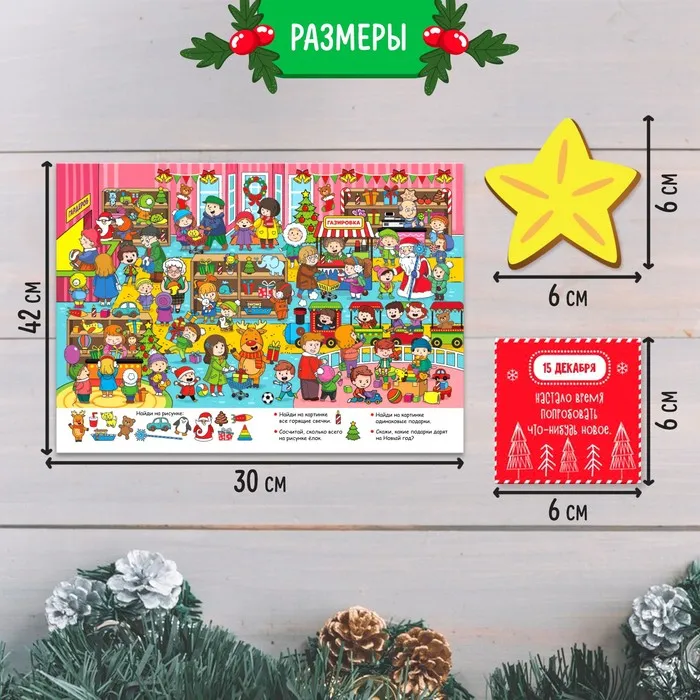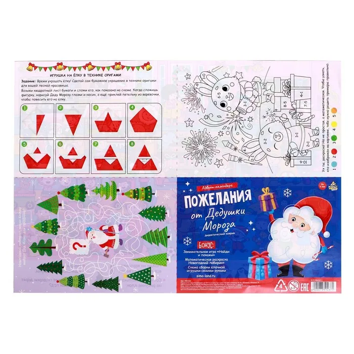- В комплект входит занимательная игра «Найди и покажи», математическая раскраска, новогодний лабиринт и схема сборки ёлочной игрушки своими руками.