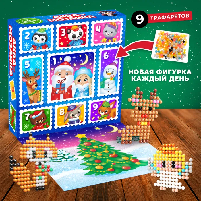 Адвент-календарь скрасит дни в ожидании праздника и поможет весело и с пользой провести время. Набор представляет собой коробку с 9 окошками. Новый день — это новое окошко, в котором находятся шарики для сборки аквамозаики.