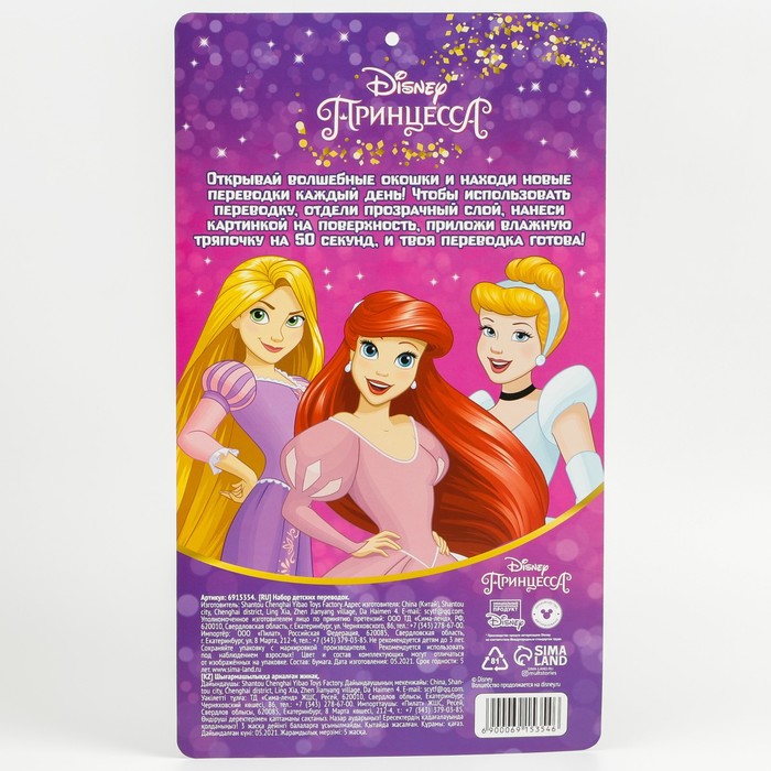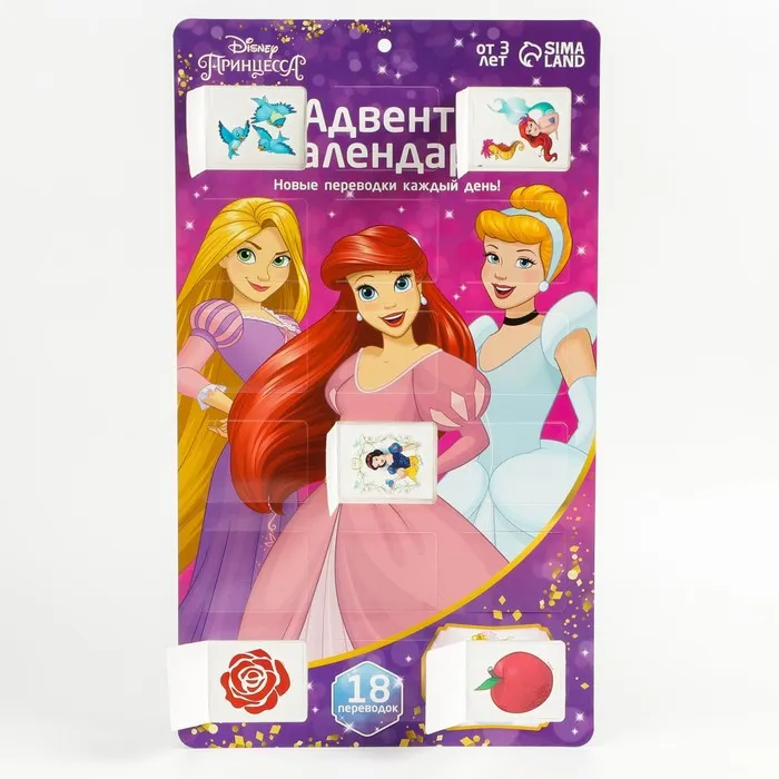 Адвент-календарь «Рапунцель, Ариель, Золушка», с детскими татуировками — 18 шт., Принцессы Disney — Характеристики