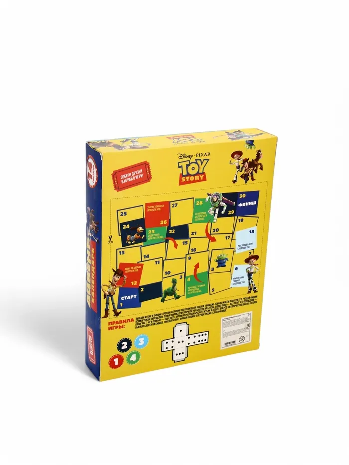 На обратной стороне упаковки спрятан еще один сюрприз — настольная игра! Бросай кубик, двигай фишку по игровому полю и проходи испытания вместе с Вуди, Баззом и другими персонажами!