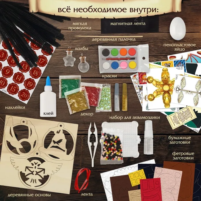 - Комплект материалов для творчества: фетр, декор, аквамозаика, деревянные основы, трафареты и многое другое.
