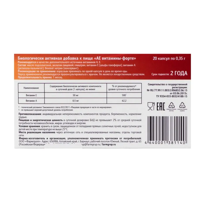 АЕ витамины-форте, 20 капсул по 350 мг. — Характеристики