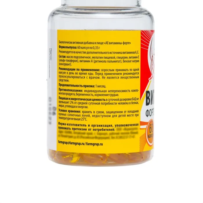 Состав: Масло подсолнечное, желатин пищевой, глицерин, витамин E (альфа-токоферол), витамин А (ретинола-пальмитат), бензоат натрия (консервант).