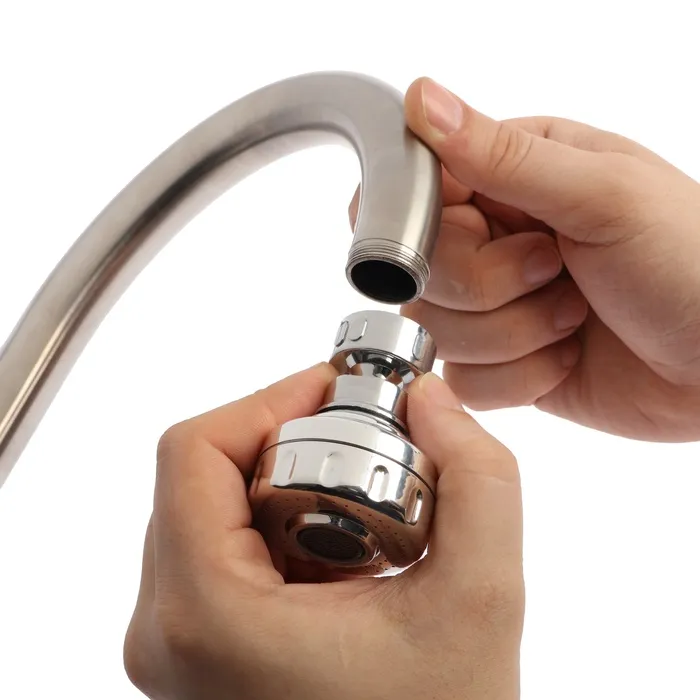 Удобная регулировка потока воды с двумя режимами работы, что позволяет легко переключаться между разными типами струи. Поворотный механизм обеспечивает гибкость в настройке направления потока, что делает использование аэратора комфортным и практичным.
