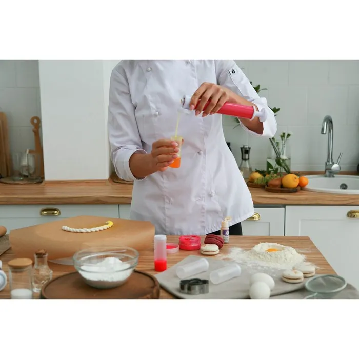 Кондитерский аэрограф — незаменимый инструмент для окрашивания тортов, пирожных и других десертов. Аэрограф дополнит арсенал как профессионального кулинара, так и любителя. Преимущество устройства в том, что цветное покрытие наносится равномерным тонким слоем. А также с этим инструментом меньше расходуется краситель, поэтому вы точно не добавите лишнего.