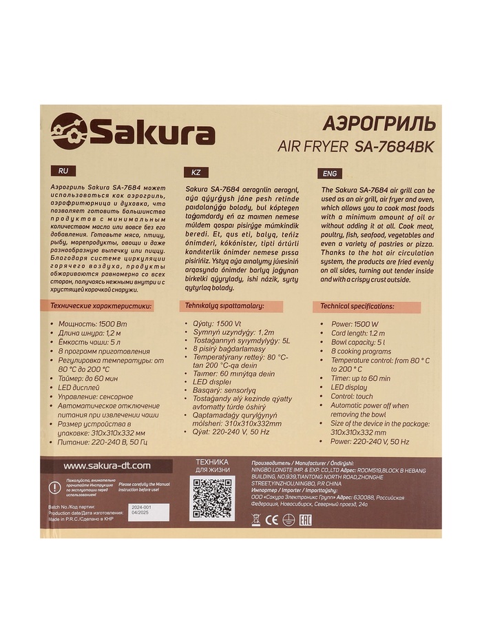 Аэрогриль Sakura SA-7684BK, 5 л, 1500 Вт, 8 программ, сенсорное управление, таймер, чёрный — Характеристики