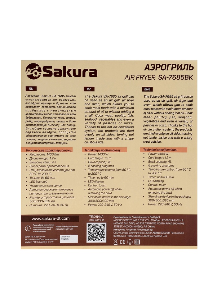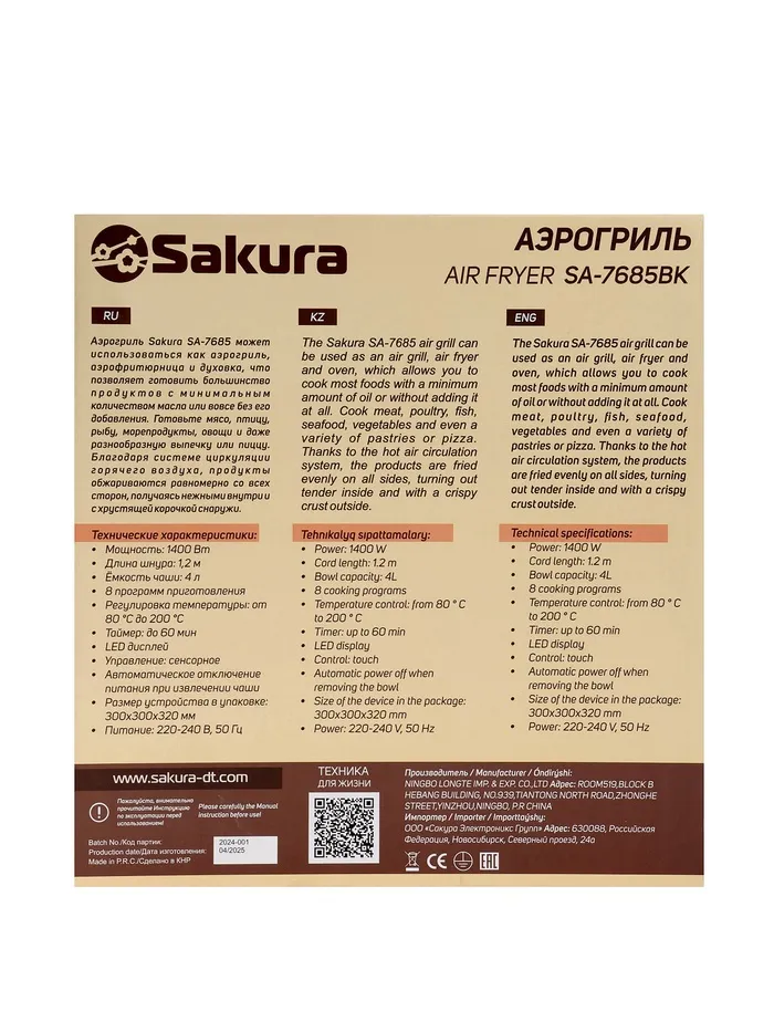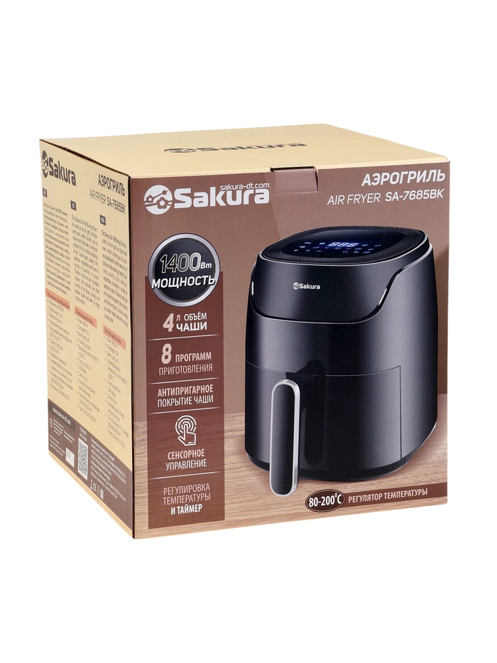 Аэрогриль Sakura SA-7685BK, 4 л, 1400 Вт, 8 программ, сенсорное управление, таймер, чёрный — Характеристики