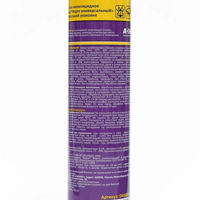 Комплексный препарат мгновенного действия для защиты дома, квартиры, дачи против насекомых. Высокоэффективное универсальное отравляющее средство от бытовых ползающих и летающих насекомых тараканов, клопов, мух, мошек, блох, муравьев, комаров, личинок и других вредителей. Без запаха химии. Одного баллона аэрозоли (флакона распылителя) хватит для обработки до 66 квадратных метров.