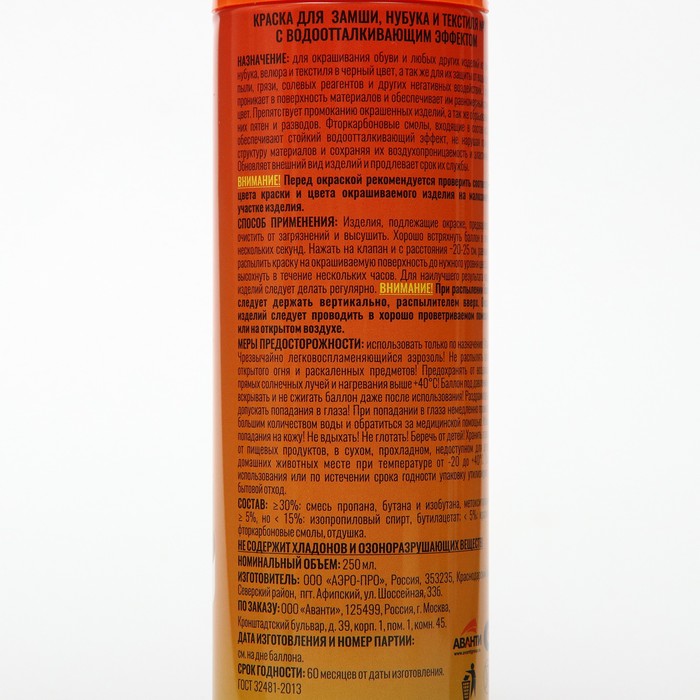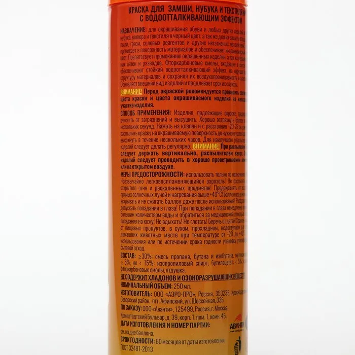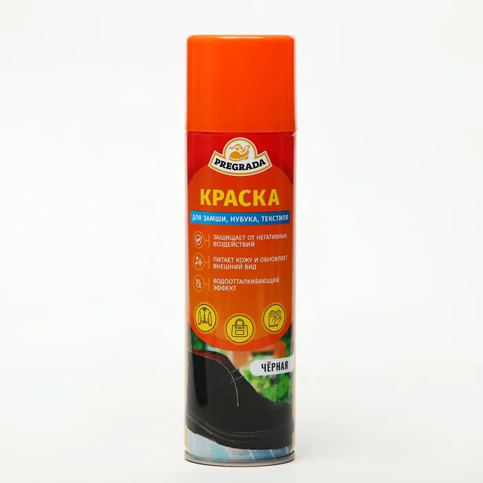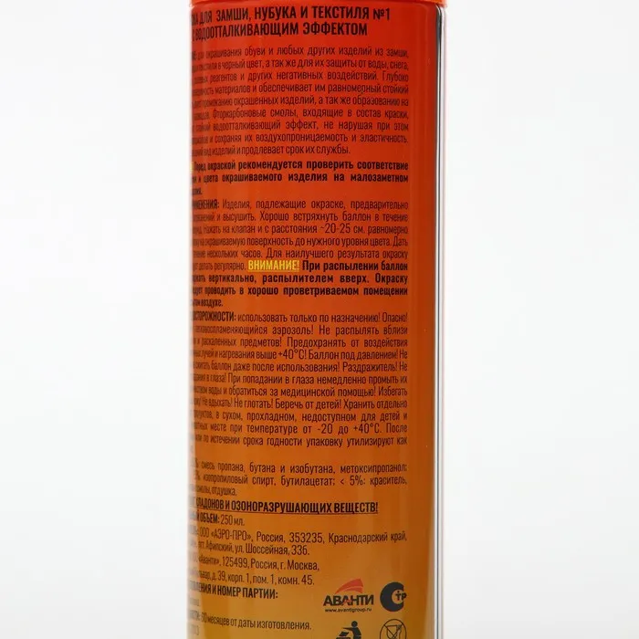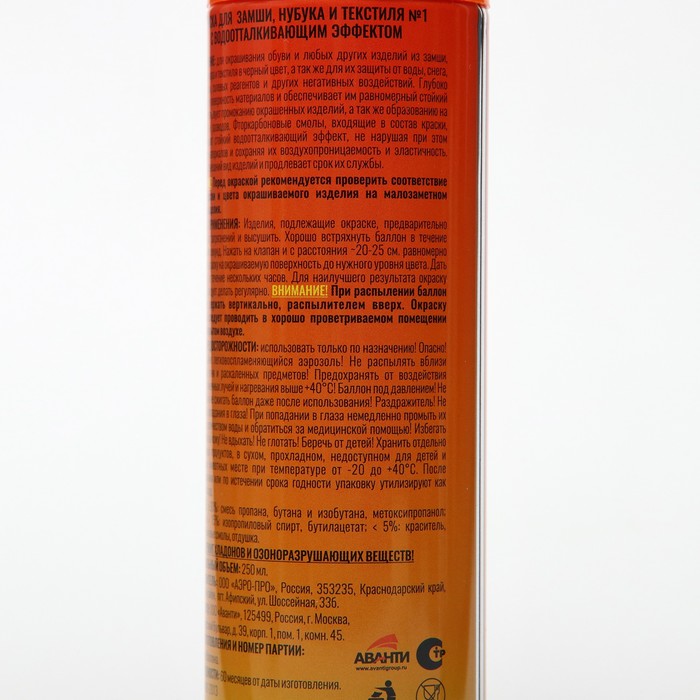 Аэрозоль-краска предназначена для восстановления и усиления яркости цвета, закрашивания потертостей, придания ухоженного вида и повышения водоотталкивающих свойств замши, нубука, велюра.