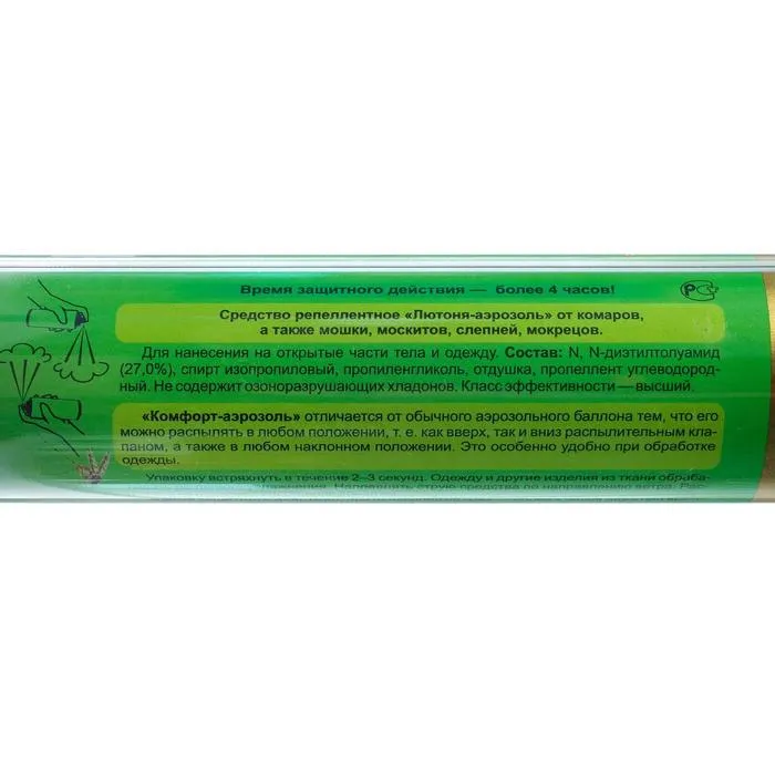 Средство репеллентное «Лютоня-аэрозоль» от комаров, а также мошки, москитов, слепней, мокрецов. Для нанесения на открытые участки тела и одежду. Время защитного действия — более 4 часов!