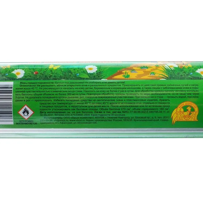 Состав: N, N-диэтилтолуамид (27,0%), спирт изопропиловый, пропиленгликоль, отдушка, пропеллент углеводородный. Не содержит озоноразрушающих хладонов. Класс эффективности — высший.