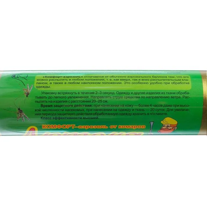 «Комфорт-аэрозоль» отличается от обычного аэрозольного баллона тем, что его можно распылять в любом положении, т. е. как вверх, так и вниз распылительным клапаном, а так же в любом наклонном положении. Это особенно удобно при обработке одежды. Для нанесения на открытые участки тела и одежду.