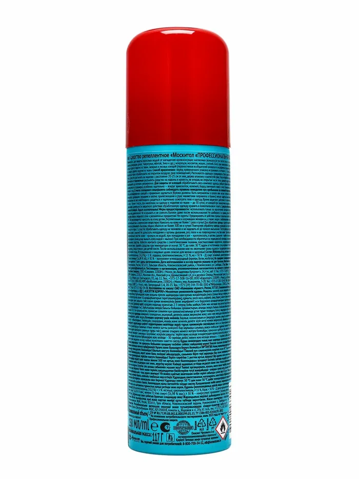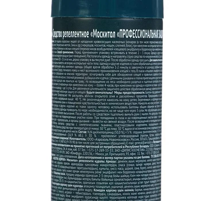 Описание: средство репеллентное для защиты взрослых людей от нападения кровососущих насекомых (комаров, мокрецов, москитов, мошек, слепней, блох), таежных и лесных клещей (переносчиков возбудителей клещевого энцефалита и боррелиоза) при нанесении на открытые части тела, одежду и другие изделия из ткани. 5 часов защиты.Способ применения: перед применением встряхните упаковку в течение 2-3 секунд. Одежду и другие изделия из ткани обрабатывать на открытом воздухе (вне помещений). Располагать одежду и направлять струю средства по направлению ветра. Средство распылять на изделия с расстояния 20-25 см от них, держа упаковку в вытянутой руке. После обработки одежду просушить. Для защиты от насекомых распылить средство на ладонь и нанести, не втирая, на открытые участки тела. Одежду и другие изделия из тканей обрабатывать до легкого увлажнения. Для защиты от клещей обрабатывать весь комплект одежды из расчета 20 сек/м², особенно тщательно - вокруг щиколоток, коленей, бедер, плечевого пояса и мест возможного проникновения клещей к телу. В очагах клещевого энцефалита соблюдайте правила поведения при пребывании на опасной территории: осматривать себя для обнаружения клещей и правильно одеваться (брюки должны быть заправлены в сапоги или носки с плотной резинкой; рубашка или куртка с длинными рукавами и плотно плотно прилегающими манжетами заправлены в брюки), нельзя садиться или ложиться на траву, по возвращении из леса необходимо раздеться и тщательно осмотреть тело и одежду.Время защитного действия: от насекомых при нанесении на кожу - более 4 часов, при нанесении на одежду и изделия из ткани - до 30 суток, от клещей при нанесении на одежду - до 5 суток. Для увеличения защитного действия обработанную одежду хранить в полиэтиленовом пакете. Средство обеспечивает неполную защиту от клещей. Будьте внимательны.Состав: диэтилтолуамид (50,0%), <5%: отдушка, триэтиленгликоль, ≥30%: пропеллент углеводородный (пропан, бутан, изобутан), 15-30%: спирт этиловый денатурированный (16,9% об.).Срок годности: 5 лет от даты изготовления.