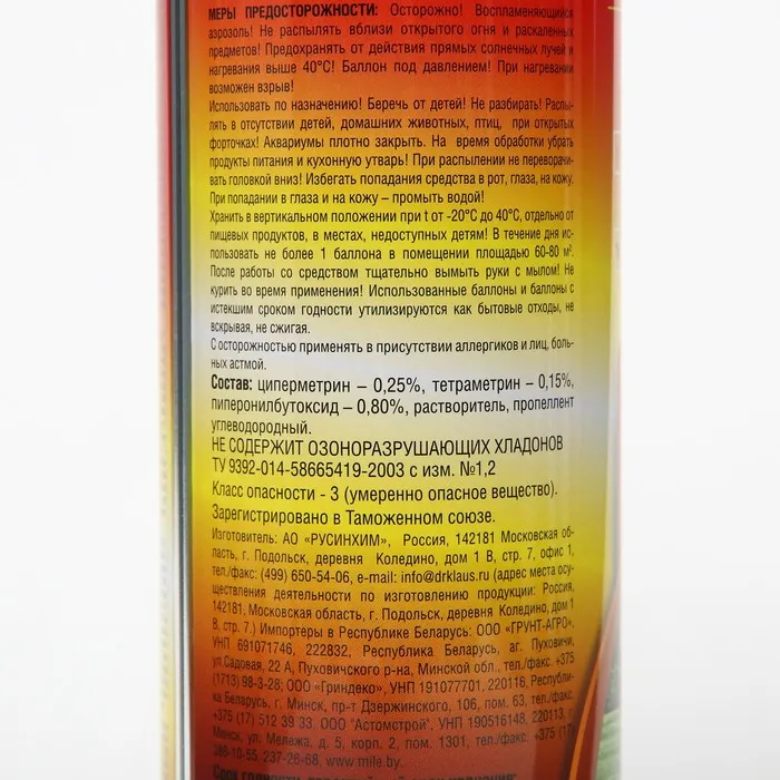 ОписаниеDr.Klaus эффективно и безопасно защищает ваше помещение от ползающих насекомых. Быстро сохнет - удобно для обработки диванов, кроватей и другой мебели. Без запаха. Достаточно обработать плинтусы, щели в стенах и мебели, обратную сторону шкафов, дверные проемы, косяки и др. и затем проветрить комнату. Профессиональная защита от постельных клопов и блох. Продолжительный эффект после использования. Без запаха. Кол-во: 1 шт.Состав:циперметрин - 0,25%, тетраметрин - 0,15% пиперонилбутоксид - 0,80%, растворитель, пропеллент углеводородный.
