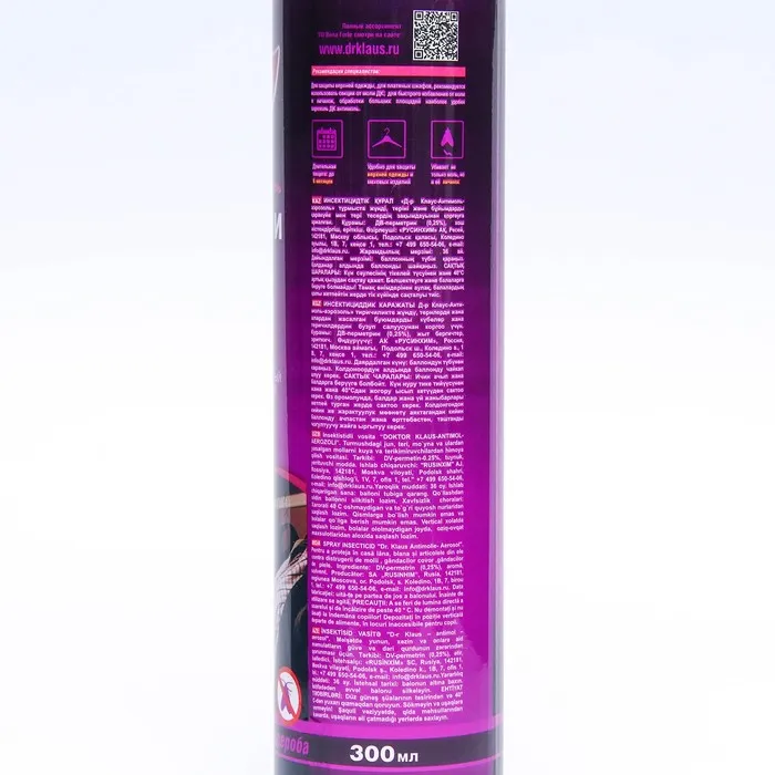 Хранение сезонных вещей без риска. Эффективен против моли, её личинок и кожееда. Уничтожает личинок, а не просто отпугивает моль. Главной фактором порчи мебели и вещей является не взрослая особь, а именно гусеница моли. Мгновенная защита вещей до 6 месяцев. Удобная обработка одежды, обуви, головных уборов. Длительность защиты до 6 месяцев. Dr.Klaus эффективно и безопасно защищает ваши вещи от моли до следующего сезона. Достаточно обработать одежду, обувь и головные уборы перед хранением и проветрить комнату. Для лучшего эффекта рекомендуется также обработать и сами места хранения – шкафы, коробки, ящики. Лёгкое нанесение - Шаг 1: откройте двери и окна, встряхните флакон. Шаг 2: равномерно распылите средство с расстояния 20-25 см до легкого увлажнения. Шаг 3: для лучшего эффекта обработайте места хранения: шкафы, коробки, ящики. Срок годности 3 года.СоставДВ-перметрин – 0,25 %; отдушка – 0,05%; растворитель; углеводородный пропеллент