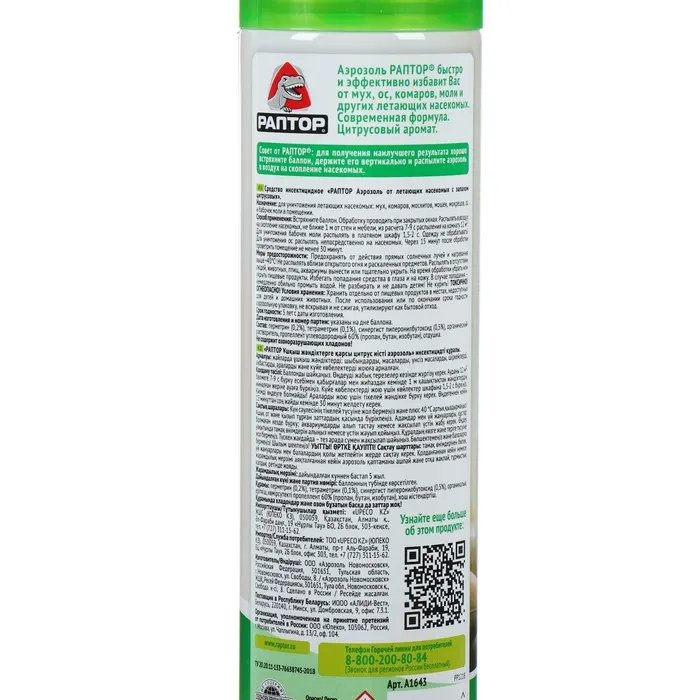 Аэрозоль от насекомых «Раптор», от летающих насекомых, с запахом цитрусовых, 275 мл — Характеристики
