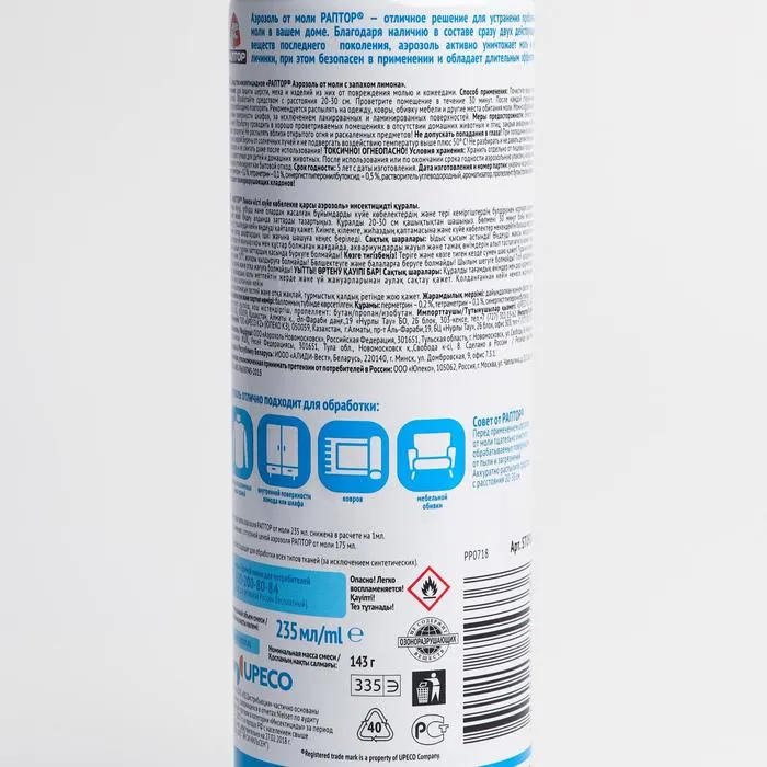 Аэрозоль от насекомых «Раптор», от моли, спрей, с запахом лимона, 235 мл — Характеристики