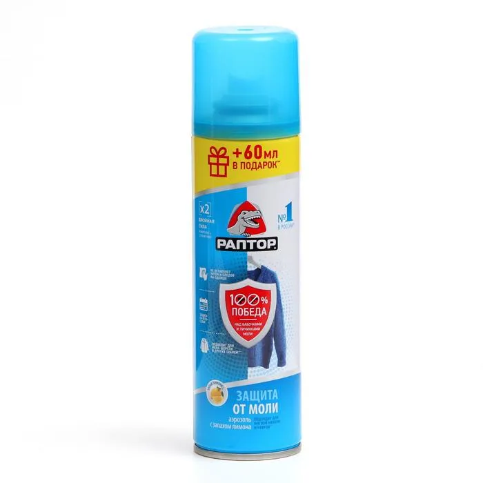 Для тех, кто предпочитает быстрые решения, идеально подойдёт аэрозольное средство от моли РАПТОР моментального действия!Активное вещество, входящее в состав аэрозоля, быстро и эффективно уничтожает бабочек моли и её личинки.Распылите аэрозоль на стенки шкафа или гардеробной плюс дополнительно обработайте вещи, нуждающиеся в особой защите.Благодаря мелкодисперсному распылителю аэрозоль РАПТОР не оставляет пятен и следов на одежде.А лёгкий свежий аромат лимона станет приятным дополнением к вашей защитной ауре.Прямо сейчас действует супер промо-предложение - 60 мл Аэрозоля от моли Раптор в подарок!Раптор-эффект: насекомых нет!Секрет популярности аэрозоля от моли РАПТОР:- Активное вещество в составе эффективно уничтожает бабочек моли и ее личинки- Мгновенное действие- Не оставляет пятен и следов на одежде- Обладает легким свежим ароматом лимона- Надёжная защита на весь сезон.СоставПерметрин (0,2%), тетраметрин (0,1%), пиперонилбутоксид (ППБ) - синергист - 0,5%, растворители, пропеллент: бутан/пропан/изобутанКомплектация