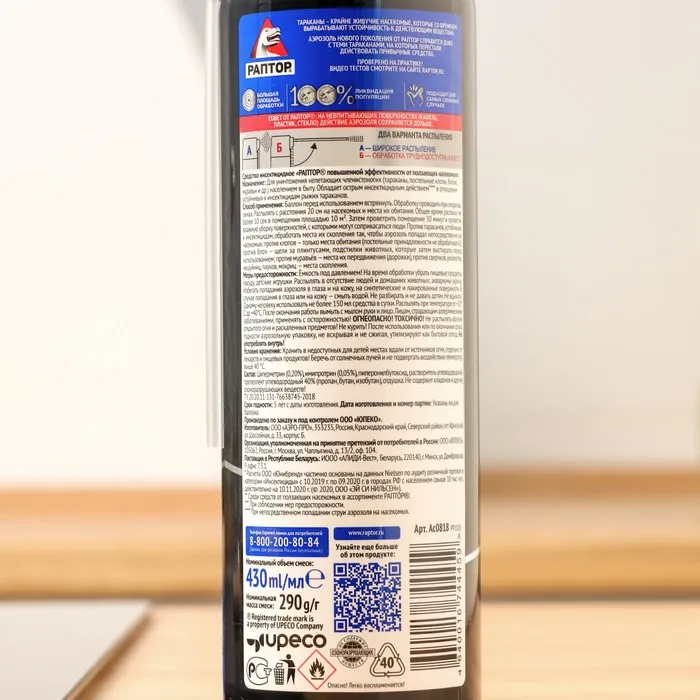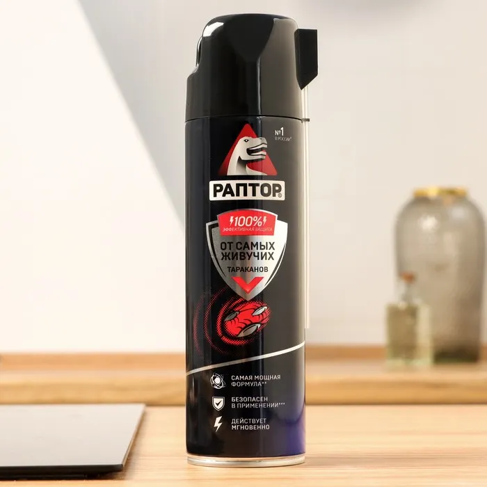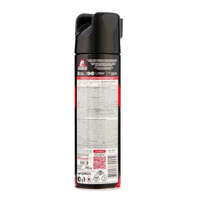 Уникальная, не имеющая аналогов формула, в состав которой входят три активных вещества с разным механизмом действия плюс усилитель-синергист, обеспечивает мгновенный результат с пролонгированным пост-эффектом. Гарантия 100% ликвидации всей популяции даже в самых сложных случаях! Аэрозоль РАПТОР от резистентных тараканов – ваша безоговорочная победа даже над самыми живучими тараканами!Состав: Циперметрин 0,2%, тетраметрин 0,2%, пиперонилбутоксид 0,5%, растворители, пропеллент (бута/пропан/собутант), вода.