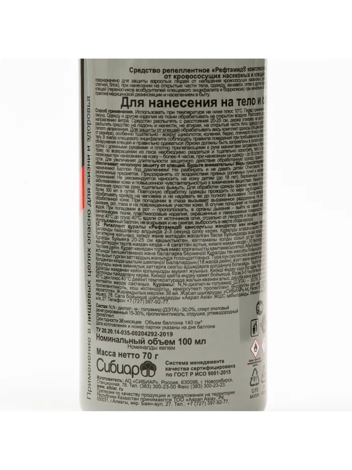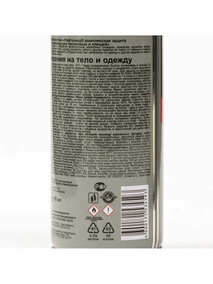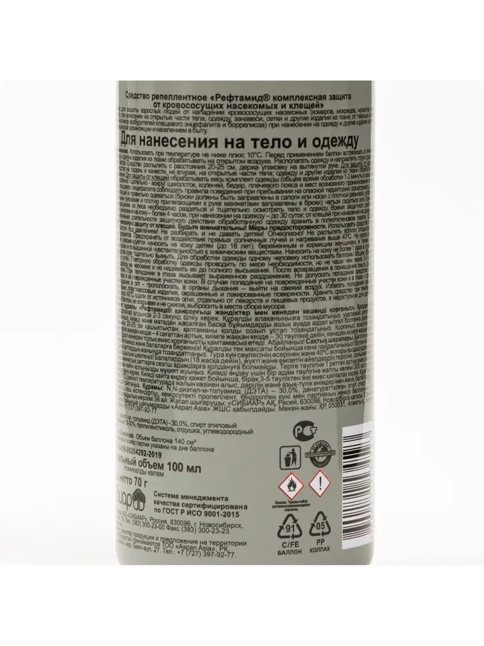 В наше время защита от насекомых является неотъемлемой частью нашей повседневной жизни. Укусы комаров и мошек не только вызывают дискомфорт, но и могут стать причиной различных заболеваний. Одним из эффективных средств защиты от насекомых является репеллентный аэрозоль "Рефтамид". Данный аэрозоль представляет собой универсальное средство от комаров и мошек, которое обладает приятным ароматом ванили. Он разработан на основе натуральных компонентов, что делает его безопасным для использования как в помещении, так и на открытом воздухе. Основным действующим веществом репеллента "Рефтамид" является диэтилтолуамид, который обладает высокой эффективностью против насекомых. Он быстро и надежно защищает от комаров и мошек, не оставляя на коже неприятного ощущения липкости или жирности. Аэрозоль "Рефтамид" имеет двойное действие: помимо защиты от насекомых, он также увлажняет кожу. Благодаря содержанию глицерина и пропиленгликоля, кожа остается мягкой и увлажненной даже в условиях жаркой погоды. Применение аэрозоля "Рефтамид" просто и удобно. Достаточно распылить средство на кожу или одежду в тех местах, где есть риск нападения насекомых. Репеллент действует в течение нескольких часов, обеспечивая надежную защиту от комаров и мошек. В заключение можно сказать, что аэрозоль репеллентный "Рефтамид" является эффективным и безопасным средством защиты от насекомых. Его универсальность, приятный аромат и увлажняющее действие делают его незаменимым помощником в борьбе с комарами и мошками. Состав: N,N-диэтил-м-толуамид (ДЭТА) 15,75%,диметилфталат 13,5%,спирт этиловый денатурированный,вспомогательные компоненты,отдушка