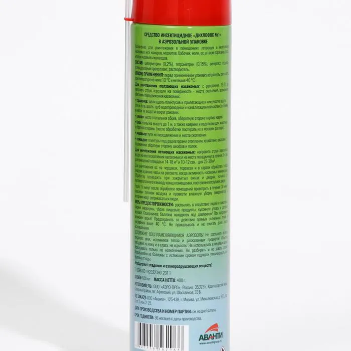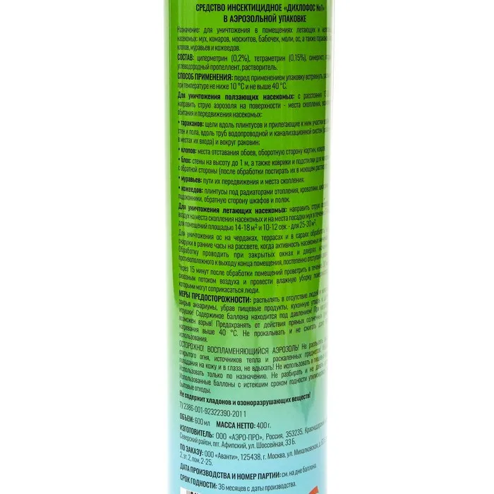 Аэрозоль от всех видов насекомых "Argus MAX" , дихлофос, без запаха, 600 мл — Характеристики